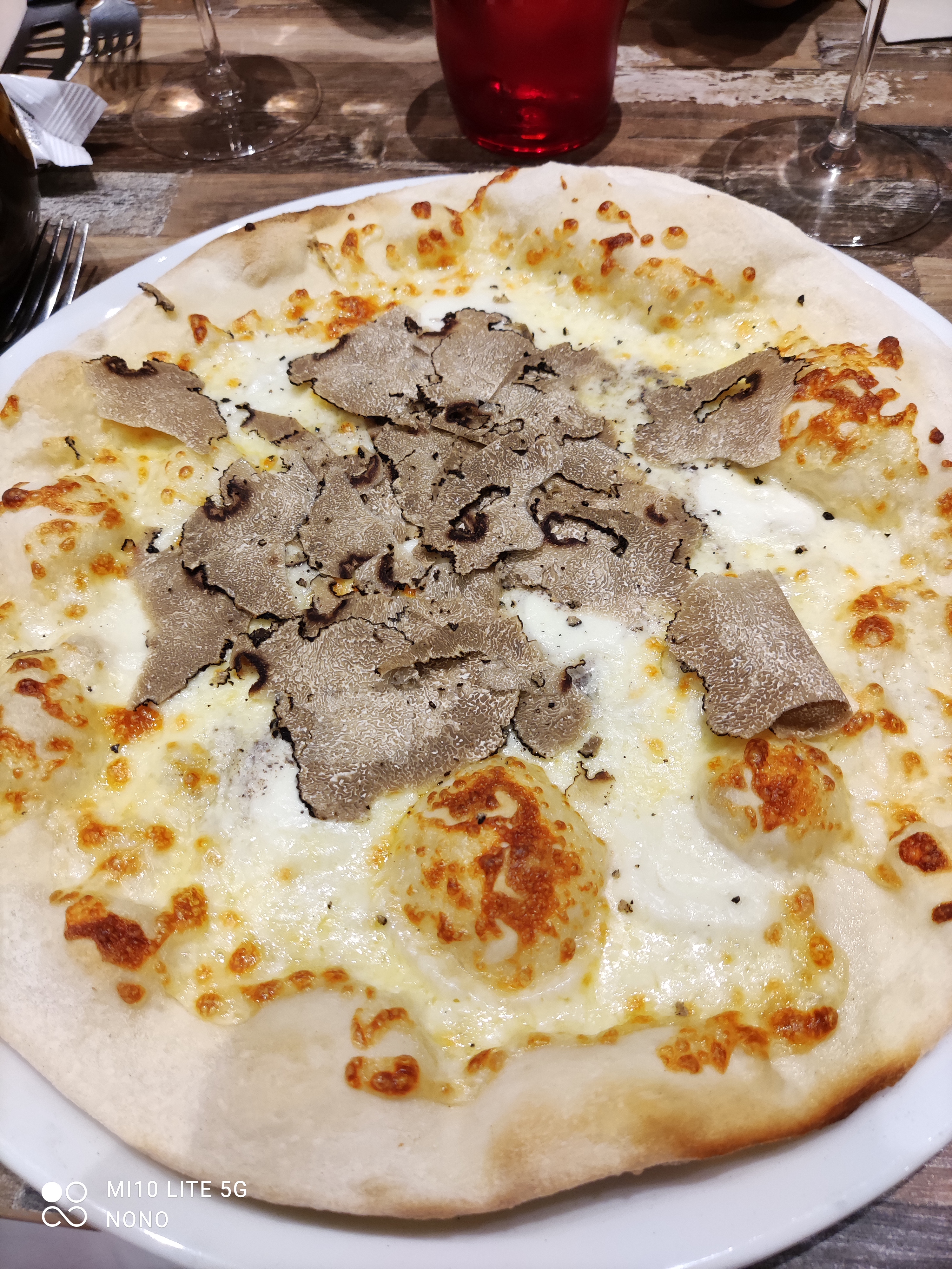 Pizza aux truffes excellente accompagnée d’un vin rouge Italien aussi excellent que la pizza
