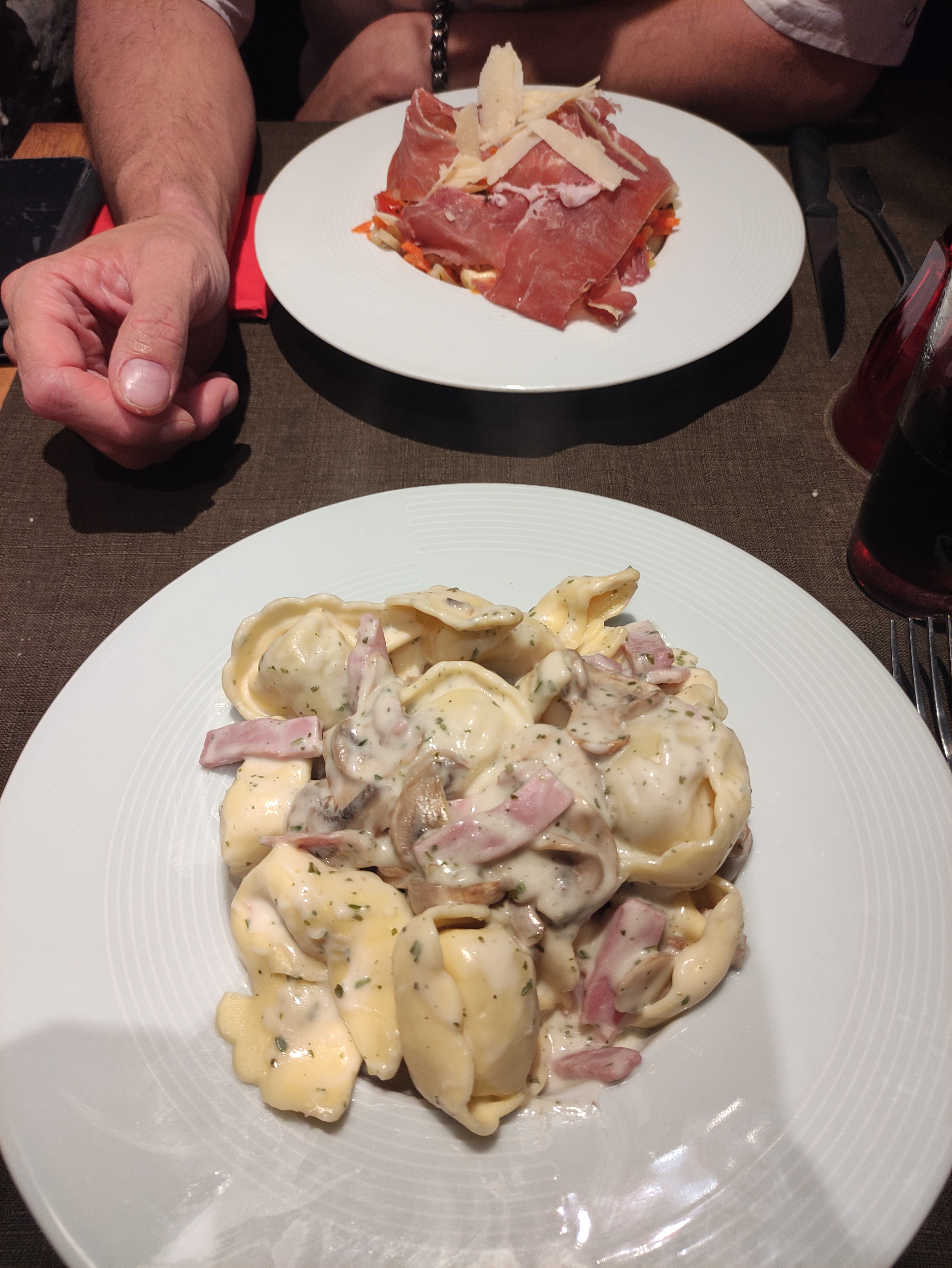 Les pizzas ont l'air bonne mais les 30min d'attente m'ont fait choisir des pâtes, les TORTELLINI DU CHEF ! Ça promet ! Et bien il faut savoir que leurs tortellini, qu'ils soient du chef ou avec d'autres sauces, sont des ravioli LUSTUCRU du super marché avec un peu de sauce qu'ils rajoutent et qui doit être tout autant industrielle. Quand je le fais remarquer à la serveuse elle me dit que c'est la sauce qui est du chef (champignons en boite, jambon cuit et crème fraîche) et s'empresse d'aller en rigoler avec ses collègues. Pas très glorieux pour un restaurant italien !