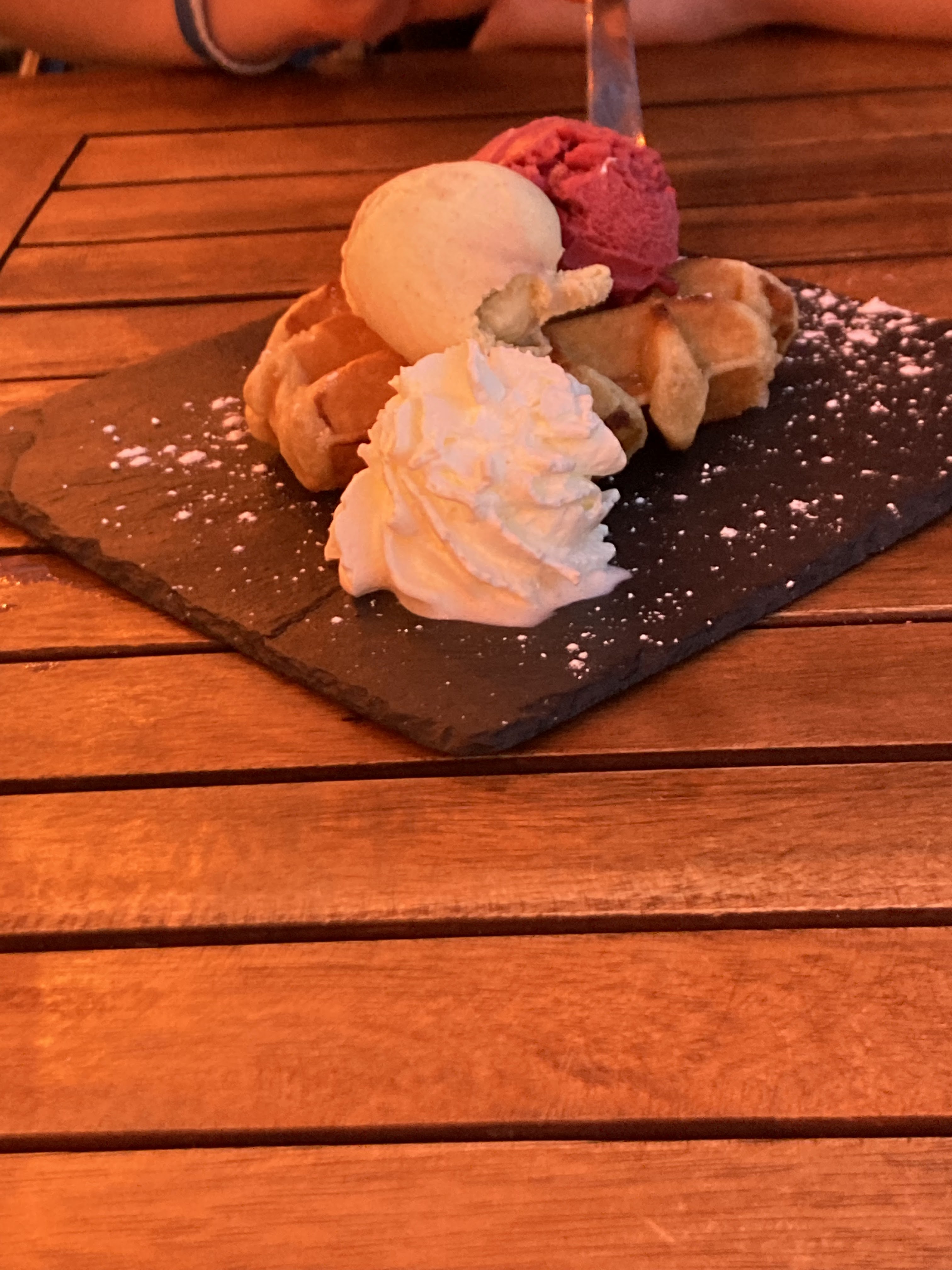 Nous avons passé une excellente soirée. Après quelques vagues d'été, nous avons eu une table avec une belle vue, le personnel sympathique nous a bien servi : avec des bowles géniaux (merci à la cuisine) et des boissons… de la bonne nourriture et un très bon dessert, une gaufre avec de la glace dessus..je peux je recommande vivement cet endroit