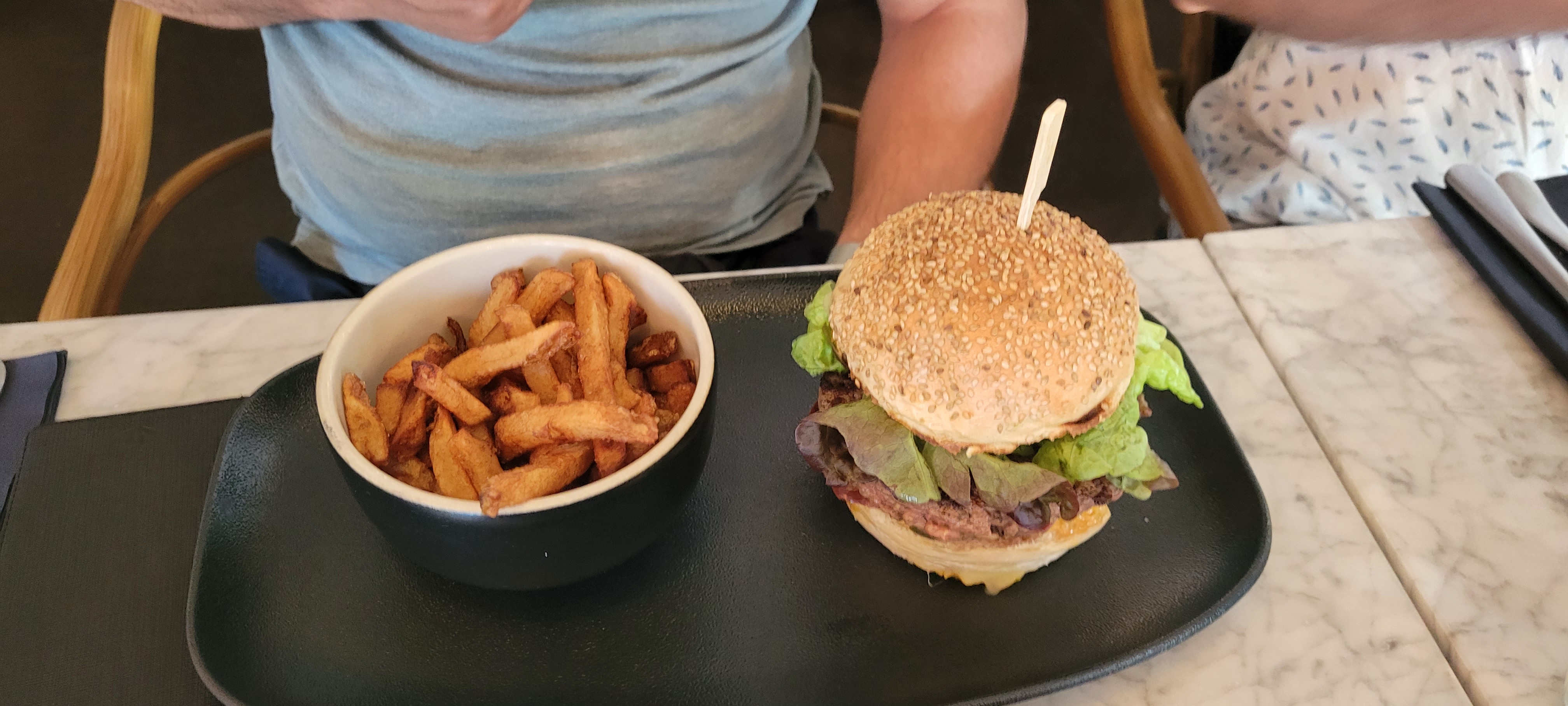 Tout était exceptionnel. Burger mémorable. Nous avons adoré le faux-filet café de Paris et puis l'omelette norvégienne comme dessert. Agréable terrasse.