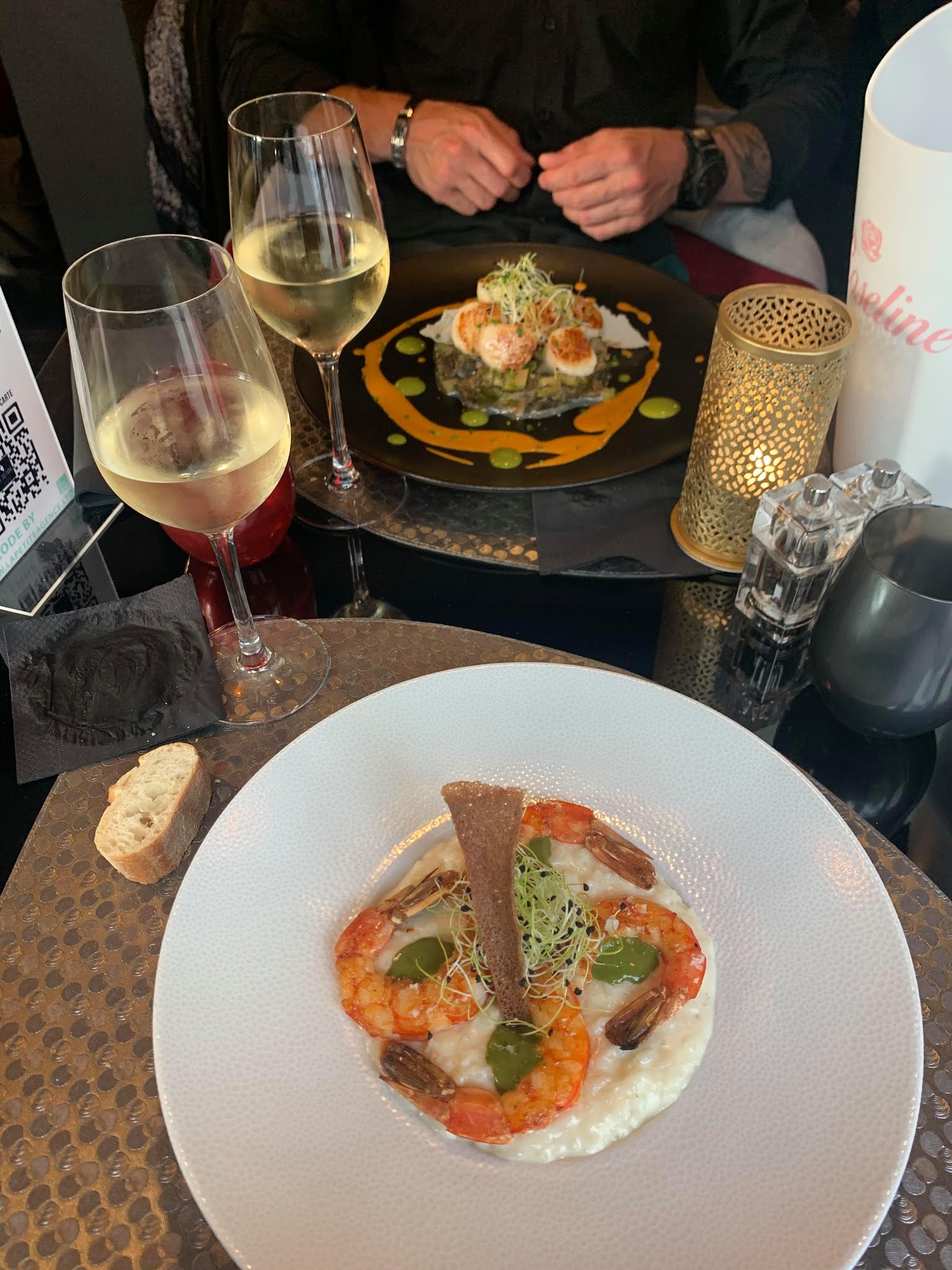 Lieu très agréable, personnel gentil et serviable. Le dîner était excellent!! (Ravioles foie gras et risotto St Jacques, vraiment raffiné !) Un petit bémol sur le vin (nous avons pris, certes, la bouteille la moins chère de la carte, mais il était trop jeune et n’avait pas un goût de vin de qualité). On recommande ce restaurant pour les raffinement des plats !!