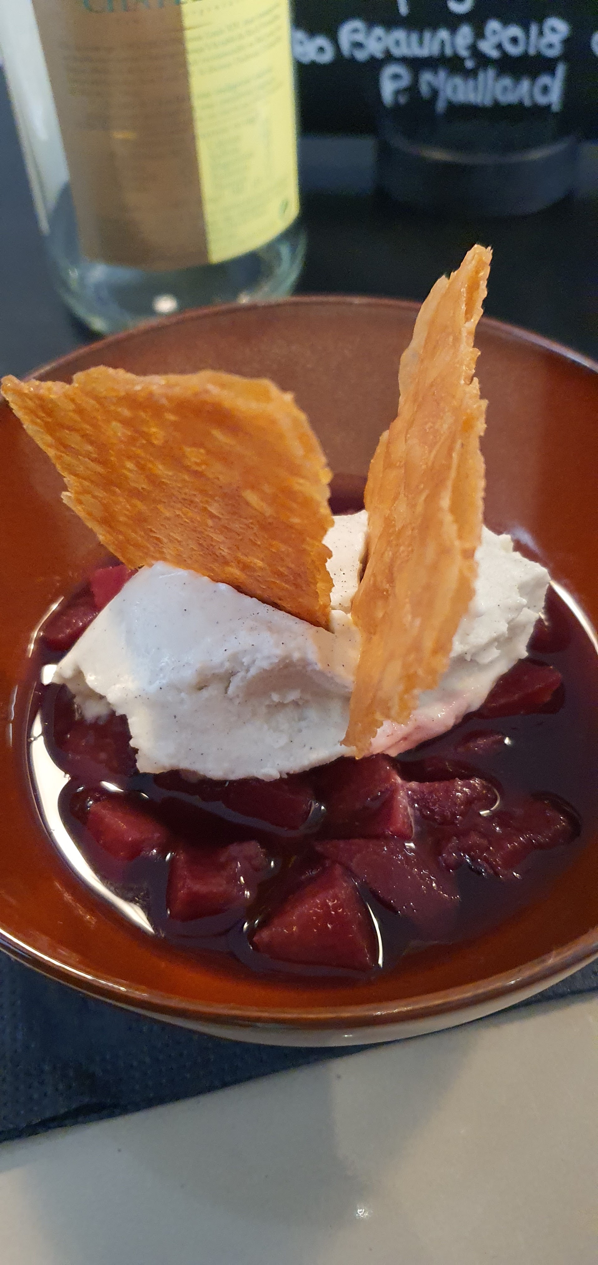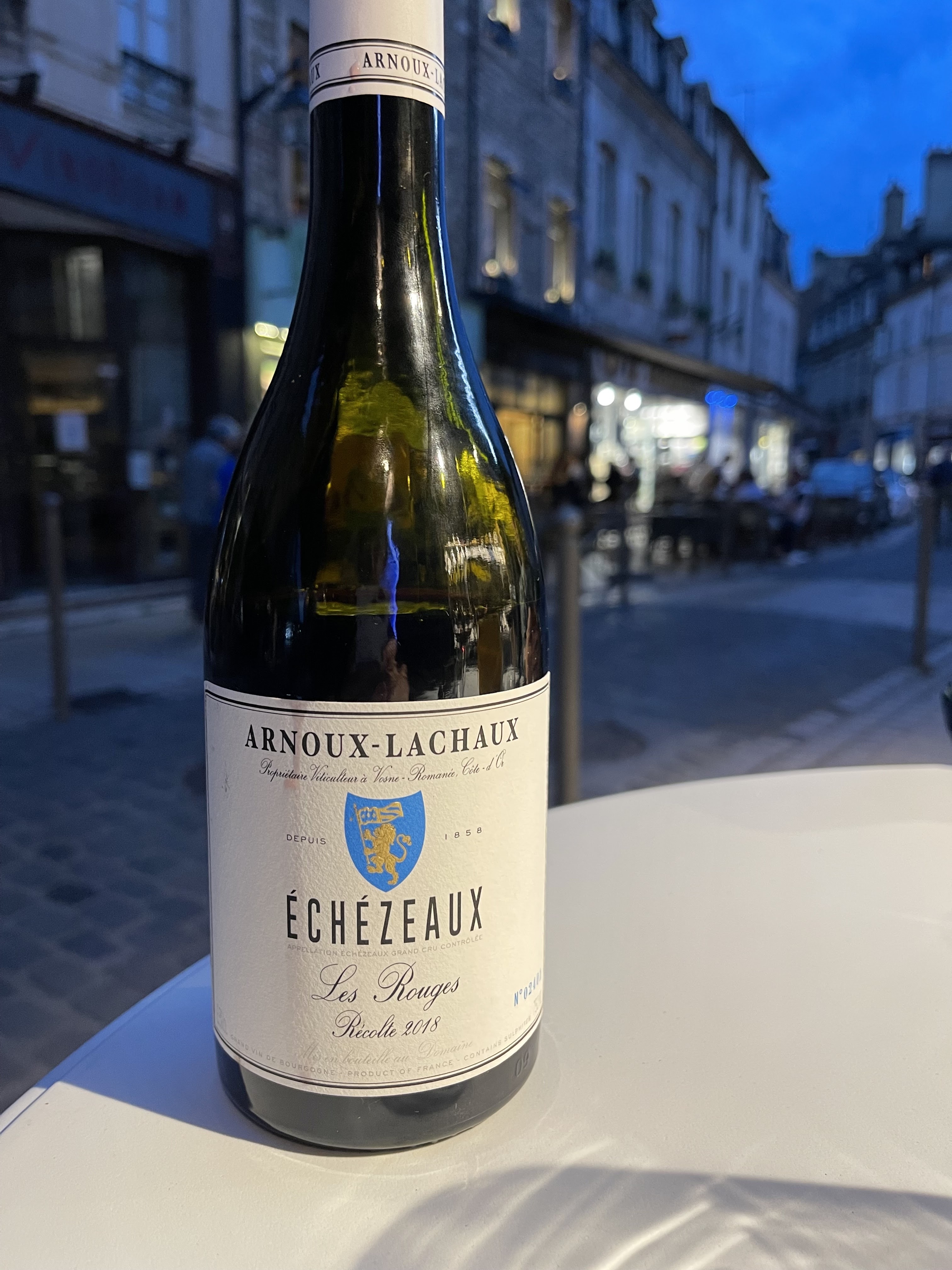 Je vais dîner à Beaune. Nourriture et vin superbes avec un excellent service