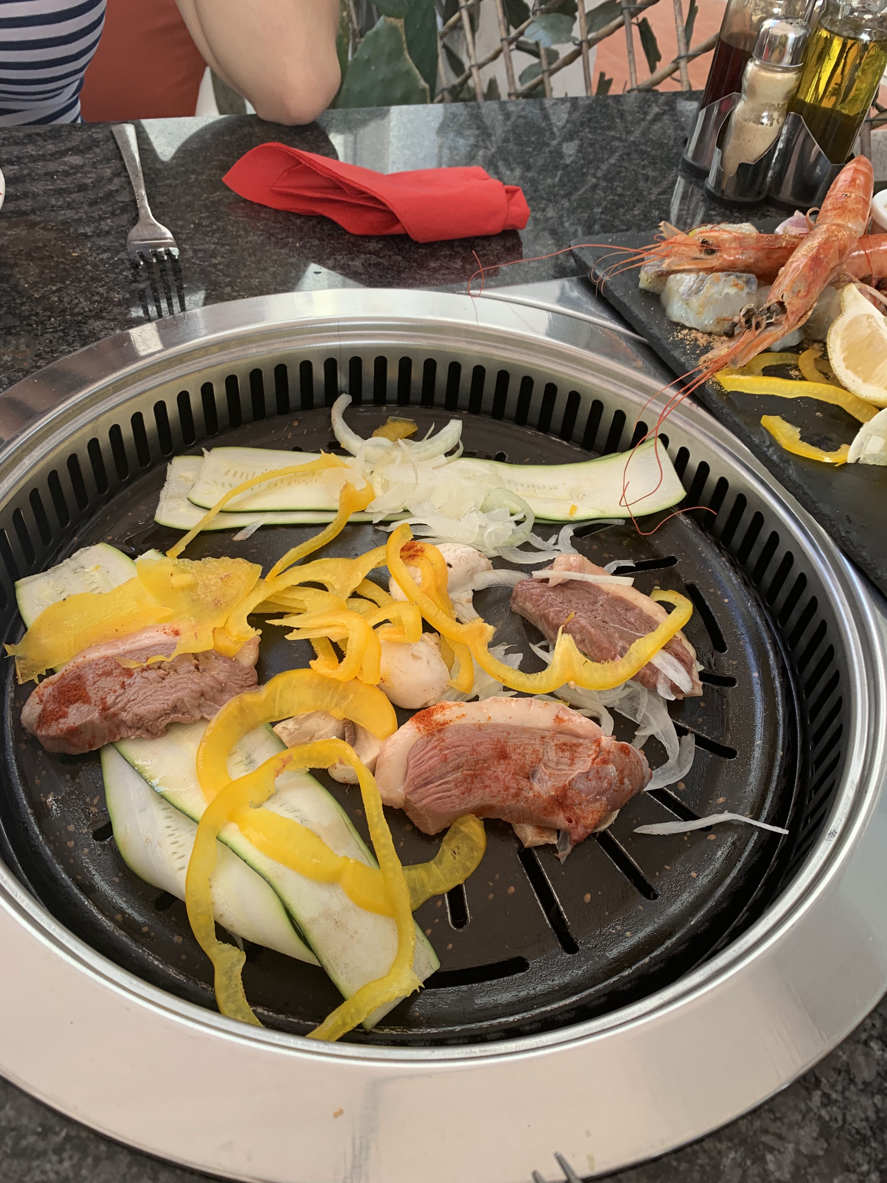 Concept original on a adoré. Ce petit barbecue a gaz au milieu de la table ou vous faite griller vos viandes et poissons comme vous le souhaitez...Une très bonne idée a partager a deux ou entre amis. Je recommande.