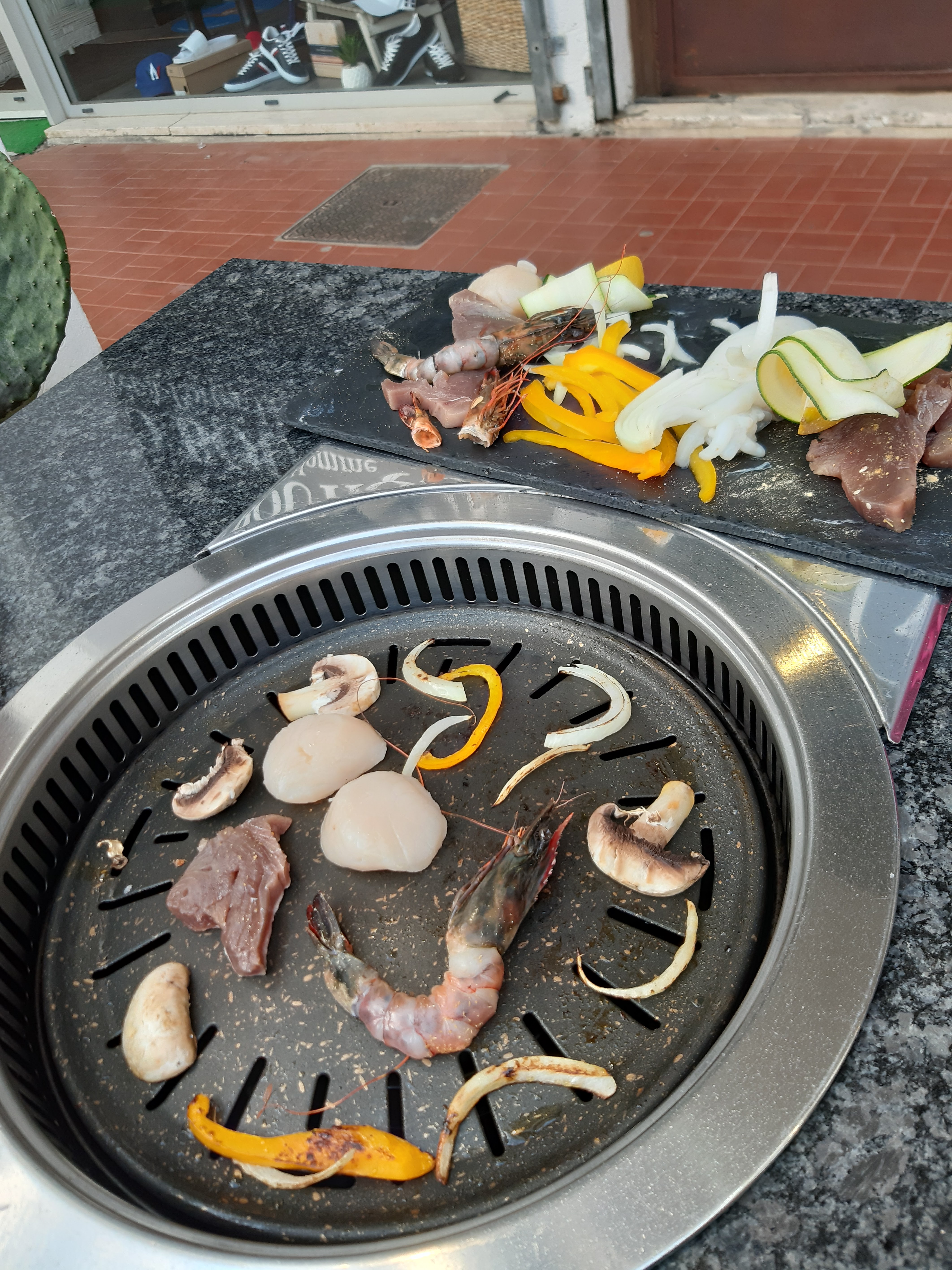 Concept très original, jamais vu ailleurs. La table contient une partie creuse qui est chauffée par le dessous Y est servi, crus, choix variés de viandes ou de poissons, dont certains délicieusement marinés avec des légumes frais, champignons, etc. Tout ça à faire cuire, à sa façon dans le dispositif de cuisson (au gaz) intégrée à la table Produits frais de très grande qualité, lieu aéré très agréable, personnel sympathique et avenant. Donc concept très original, produits frais, personnel sympathique et attentionné icontournable à La Grande-Motte, L'ESSAYER C'EST L'ADOPTER, À COUP SÛR Y RETOURNER.