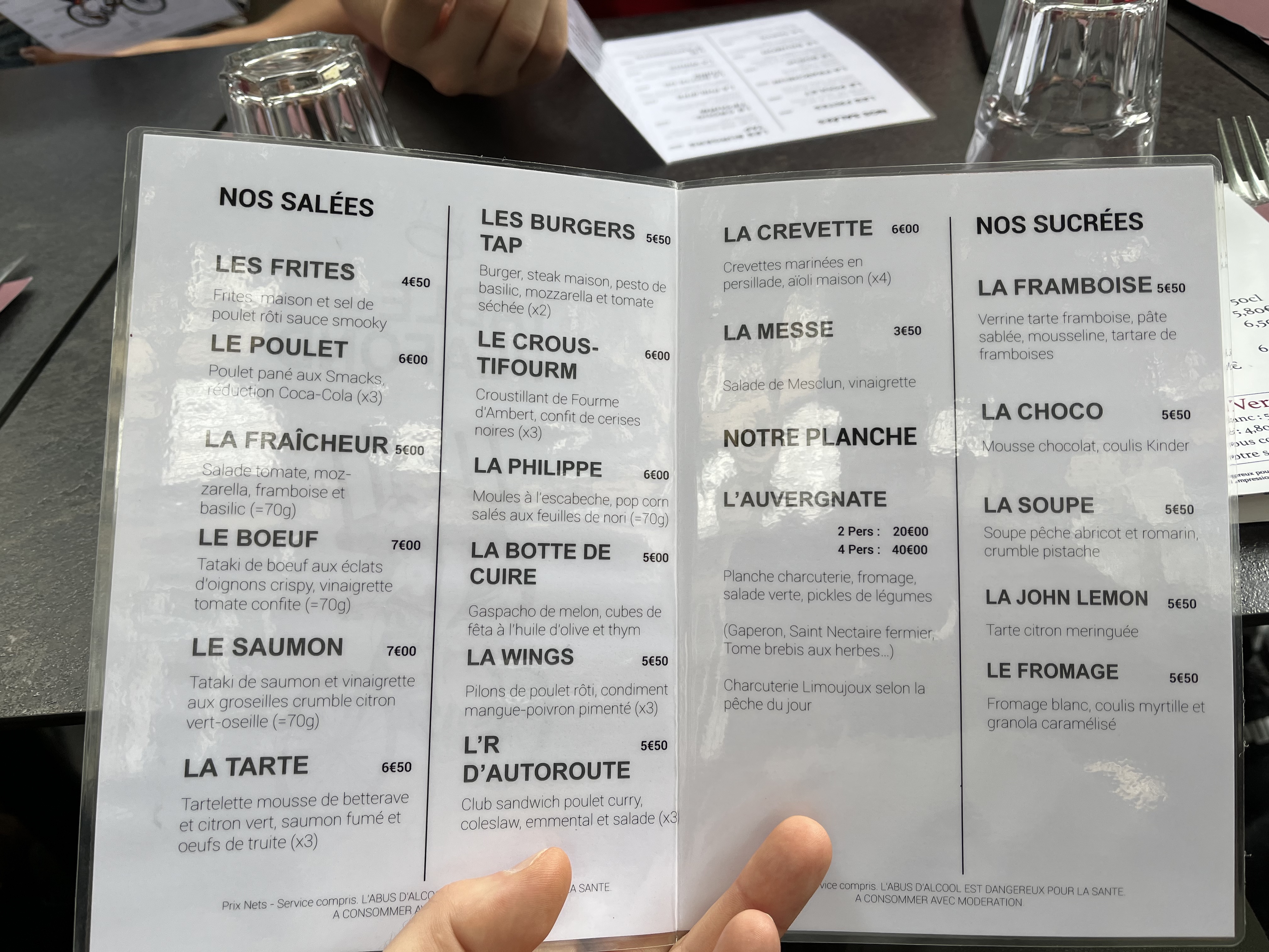 Tapas très bons! Nous avons goûté les croustilles au St nectaire, les poulets panés et une planche 🌮 pour 2. Tout était bon, juste une remarque sur la planche qui est pour 2 alors qu'il y a que 3 tacos? Les prix sont corrects 5,10€ pour les croustilles et les poulets. Et 10€ pour les tacos. J'ai trouvé les desserts vraiment très bons (île flottante au chocolat tonka amandes effilées et cheesecake fraises/rhubarbe pistaches)!