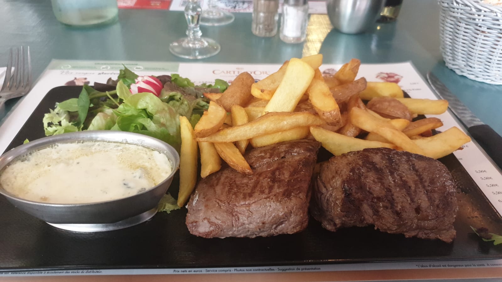 Martini servi sans glaçons, pavé de Salers très nerveux 50 grammes au moins de nerf. Couteaux changer ne coupent pas. Tres déçus