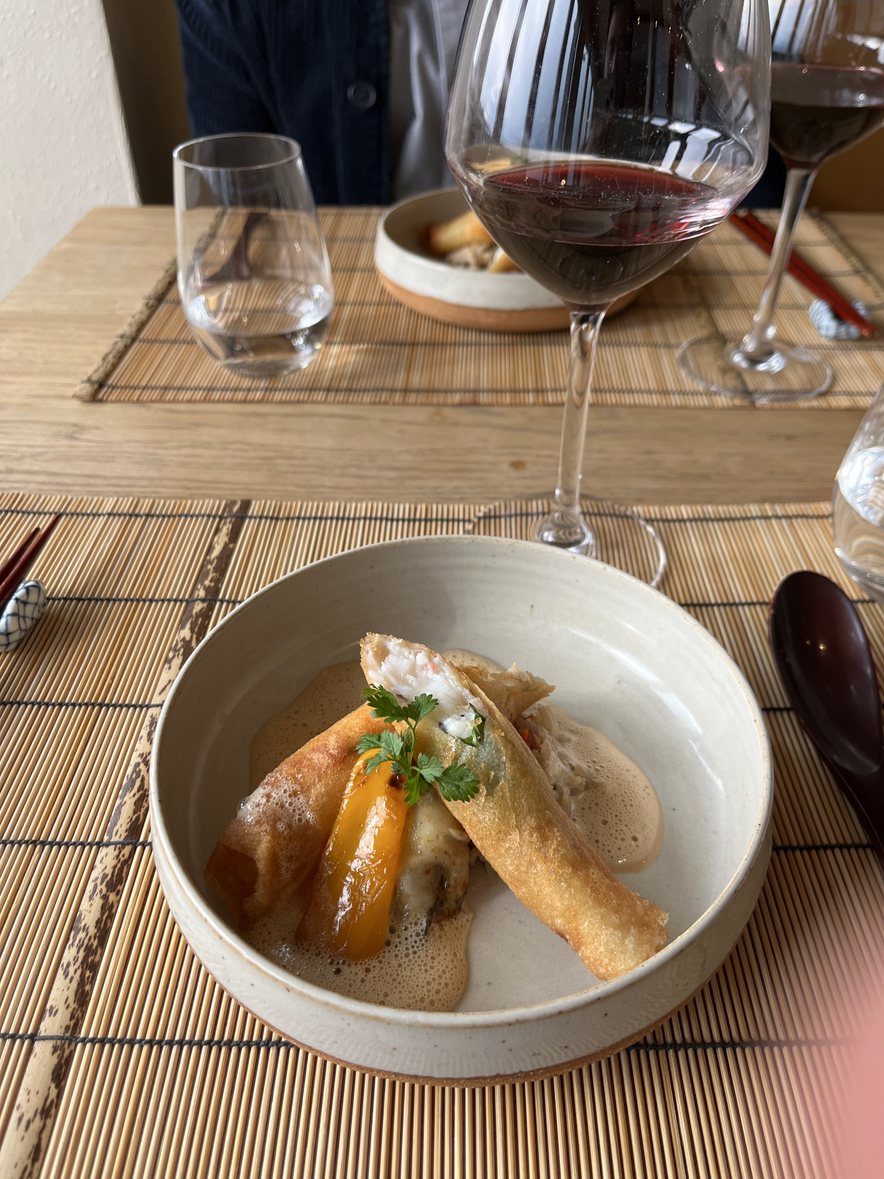 Cuisine japonaise avec la fusion des produits bretons. Quelle précision dans la mise en place des assiettes. Menu en 5 services 125 euros. Ce fut une expérience de restauration unique. J'ai particulierement kiffe le nem japonais avec du lieu jaune, et la dinde froide avec sa salade. Aussi le dessert était parfait avec des saveurs inédites. Décoration japonaise, petite salle intimiste calme. Je recommande