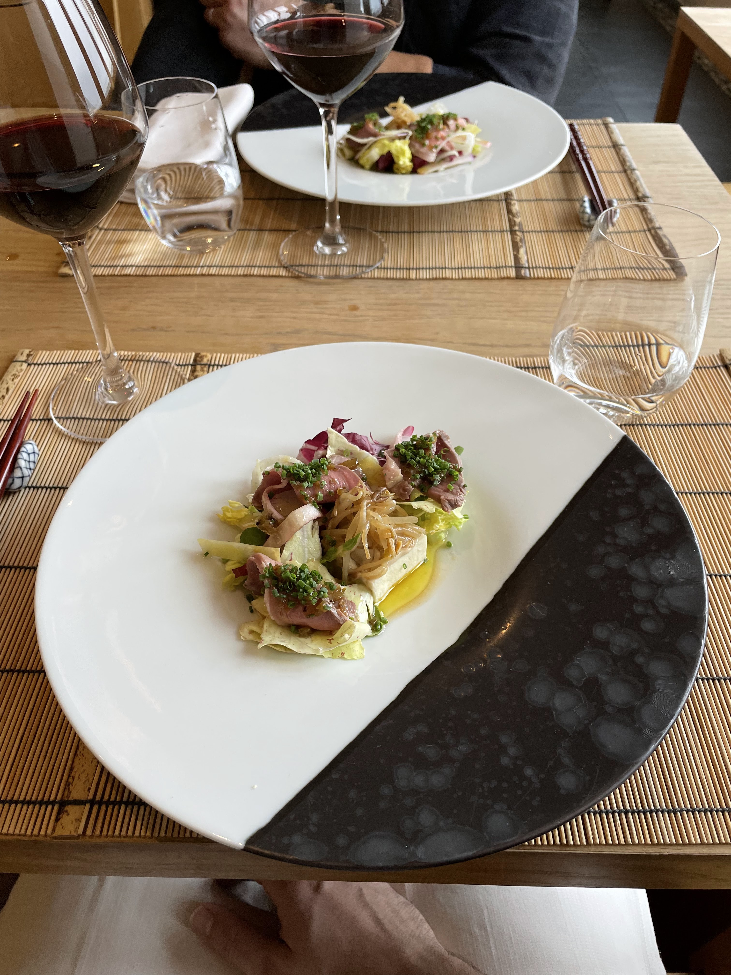 Très belle expérience. Juste quelques nuances sur l'utilisation de tomates cerises ( pas de saison !) et comme s'il fallait meubler, sans rapport avec le plat, dommage. D'autre part le canard était beaucoup mieux exprimé sur le premier plat, un peu dénaturé dans les boulettes. sinon, le reste était parfait Merci