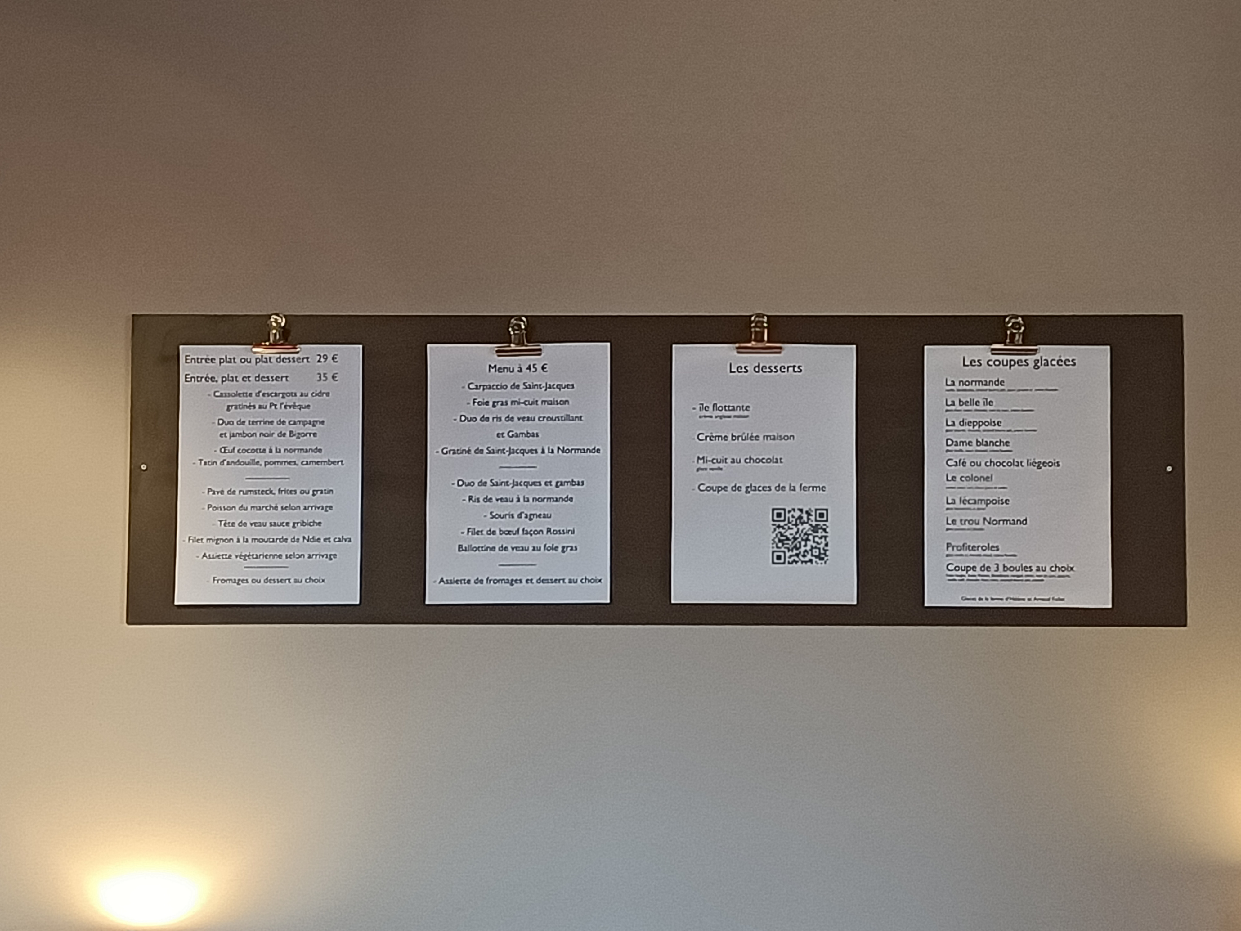 Le point fort de ce restaurant est la cuisine. Bien normande comme on l'aime. Les œufs cocotte avec du camembert et des pommes, magnifique et leurs mi-cuit un délice. Par contre le fait que la carte soit accroché au mur ou sur des panneaux, je n'aime pas du tout. Je préfère avoir un menu à table pour pouvoir choisir tranquille mon plat sans plissé les yeux pour y voir quelque chose. Et malgré tout, beaucoup trop d'attente. 45 minutes pour nous demander les desserts.