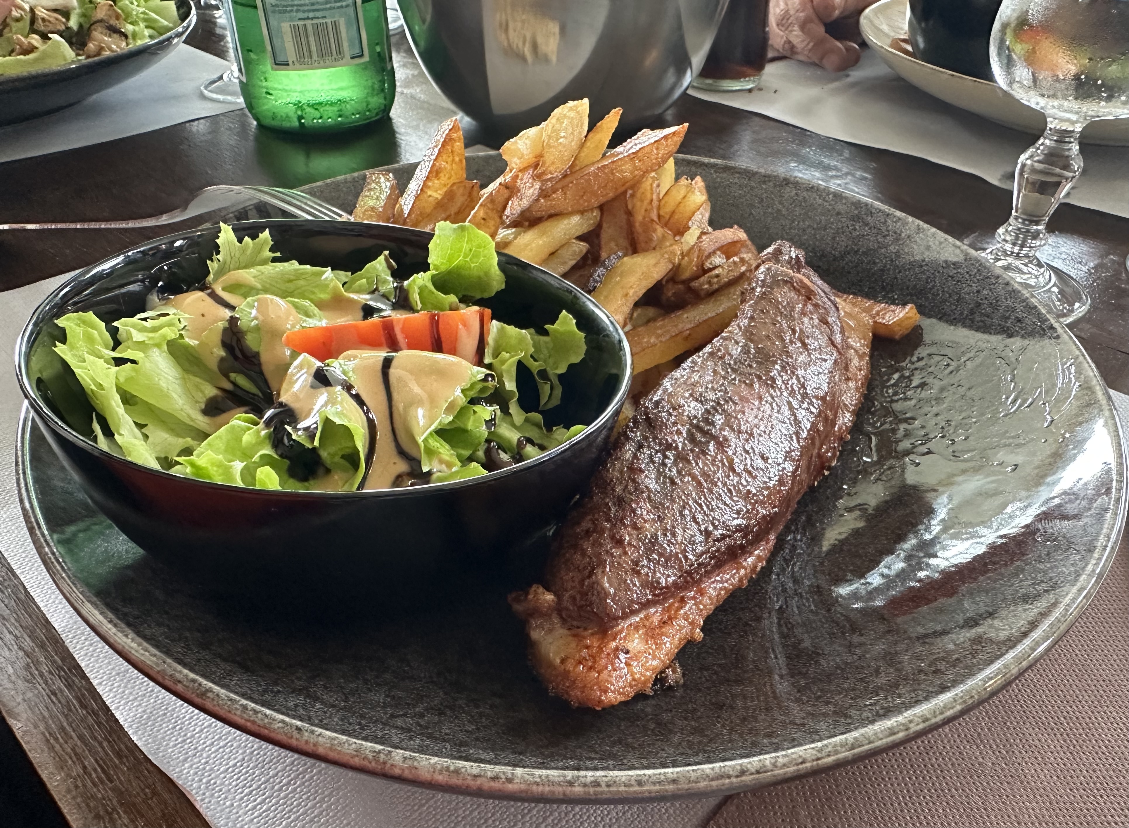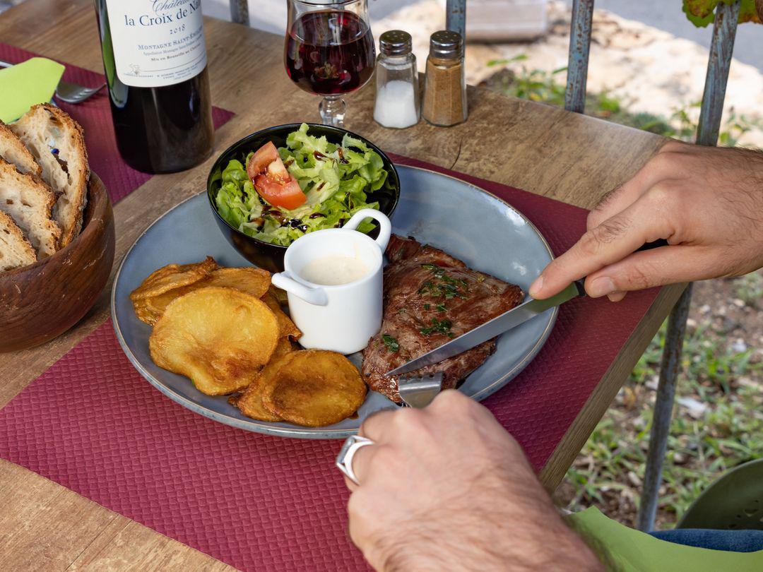adresse difficile à trouver sans GPS quand on vient de Sauveboeuf : pas vu de panneau nous invitant à tourner et c'est après avoir fait demi-tour que nous en avons trouvé un invisible dans l'autre sens. carte courte, pour nous, gage de qualité. mais pas de choix de légumes: frites et salade obligatoires. viande parfaitement cuite. plat copieux. nous avions renoncé à l'entrée heureusement. une odeur de cigarette persistante pendant tout le repas alors que personne ne fumait sur cette terrasse et que même à la fin le cuisinier venu fumer non loin de nous n'a pas créé cette odeur gênante dont nous n'avons pas compris l'origine. C'était une bonne expérience. adresse à recommander à nos clients qui visitent Lascaux.