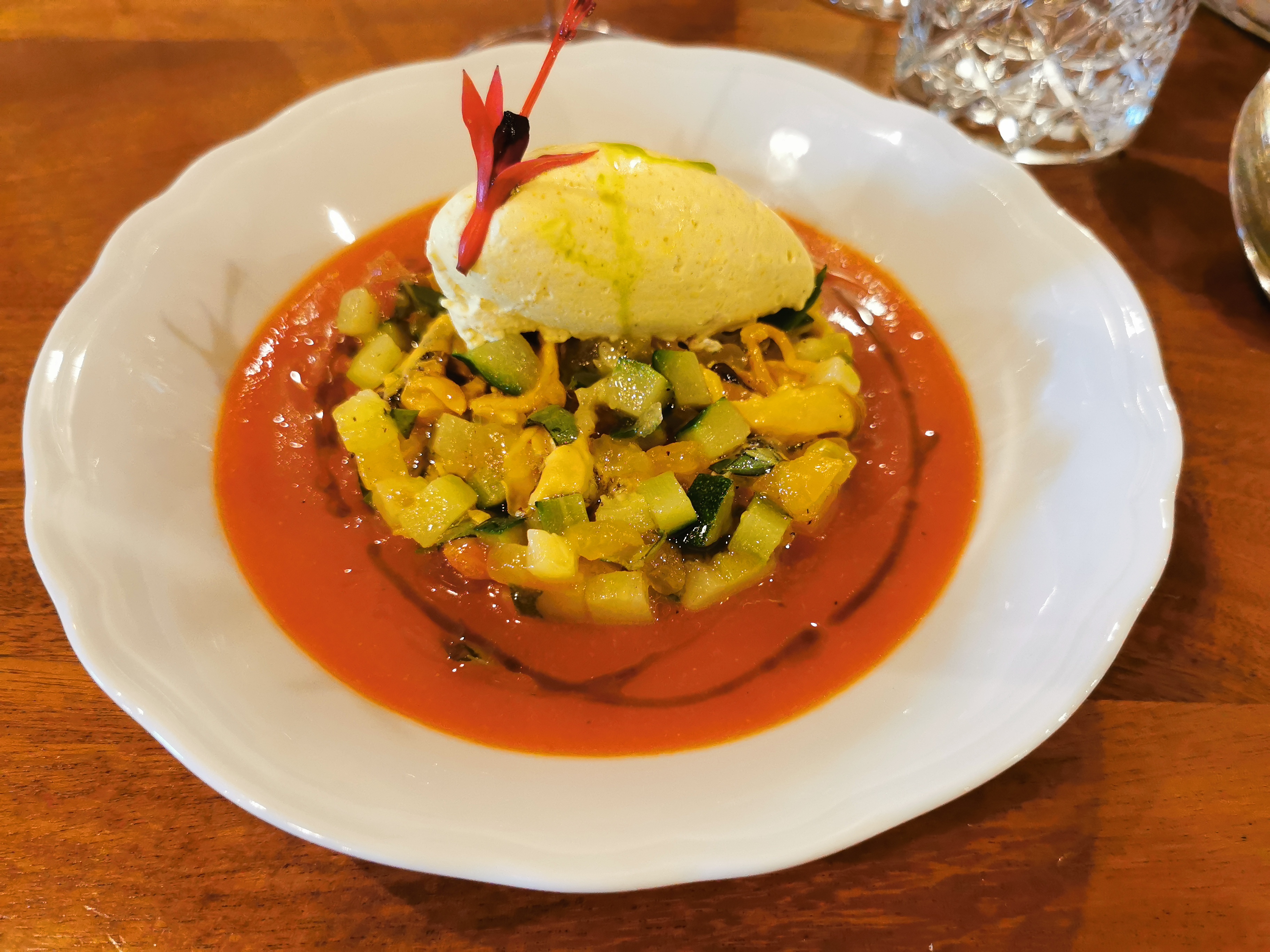 La toute première impression sera heureusement fugitive. Il faut dire qu’il y avait une canicule inhabituelle ce jour-là, et entrer dans une salle encore plus chaude, avec en plus des odeurs de cuisine… Ouf donc, il y a une petite cour intérieure presque couverte d’une belle treille avec quelques tables. Très bon accueil. Le service sera convivial. Carte intéressante, mais le menu est attractif et concurrentiel. C’est une cuisine verte, nature et équilibrée. Par exemple, les pêches du dessert sont du jardin ! Chaque fois le verre de vin différent choisi accompagnait bien chaque plat. Sensation nette en sortant d’avoir passé un moment de légèreté fortement agréable.