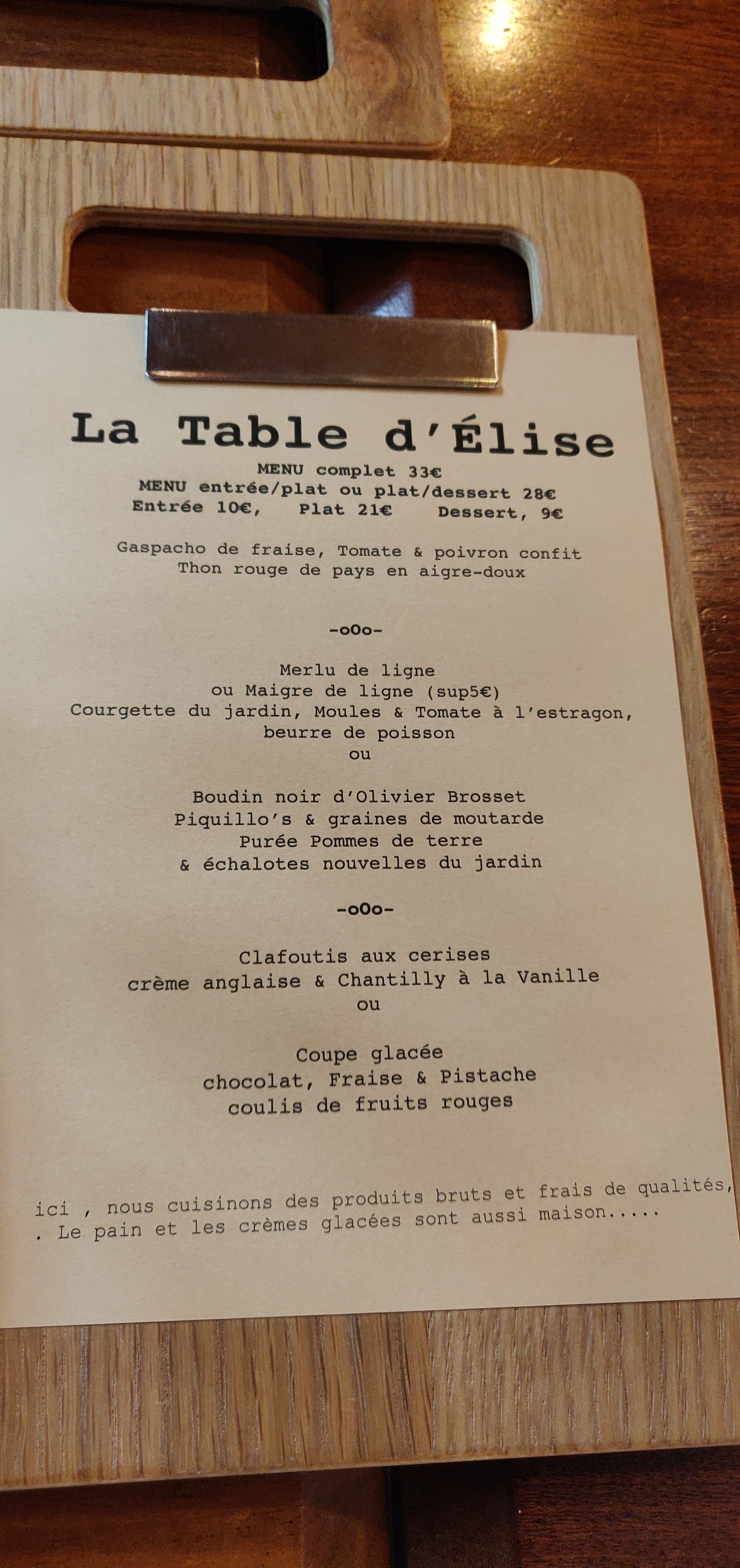Le bistrot d'une table étoilée,c'est comme un second vin de Bordeaux...on n'est que rarement déçu... La Table d'Elise fait partie de ces endroits où il fait bon manger : Une cuisine simple et de terroir,des produits frais,des poissons pêchés du jour,des propositions de menus à des prix plus que raisonnables,un cadre agréable et un accueil des plus chaleureux,avec un chef de salle hyper sympathique... Merci à Alexandre Couillon et ses équipes,pour cet agréable moment de convivialité partagé avec Ma Compagne et Sa Maman. Nous reviendrons... Lionel HIDIEN,15 Septembre 2023.