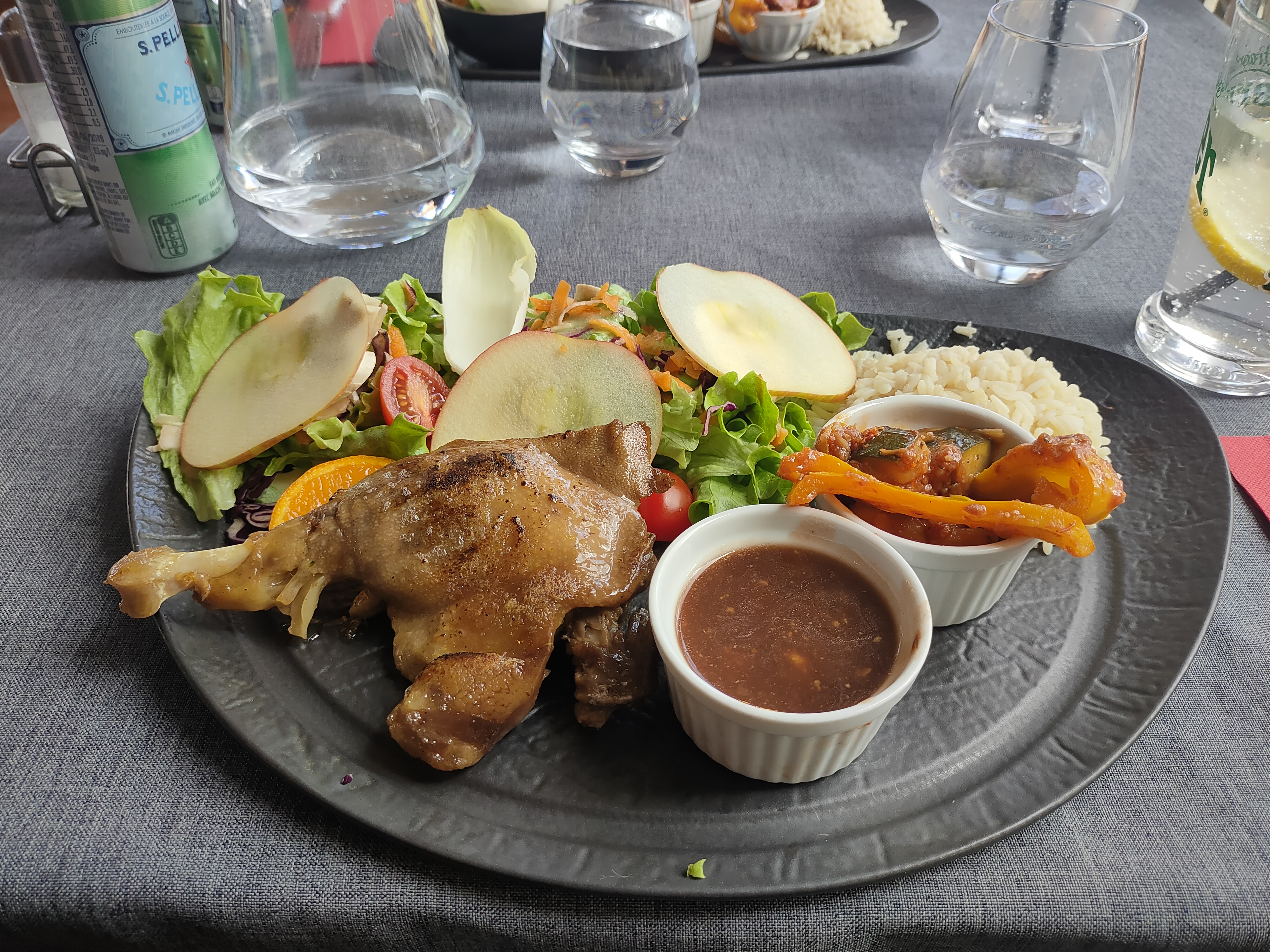 Déçu de manger sur une table en bois alors que les autres tables avaient une nappe, malgré notre sollicitation avons poursuivi notre repas sur une table bancale, et les plats n étaient pas harmoniser, servir des frites, du riz et un légume avec de la viande je trouve qu il y a une chose en trop.