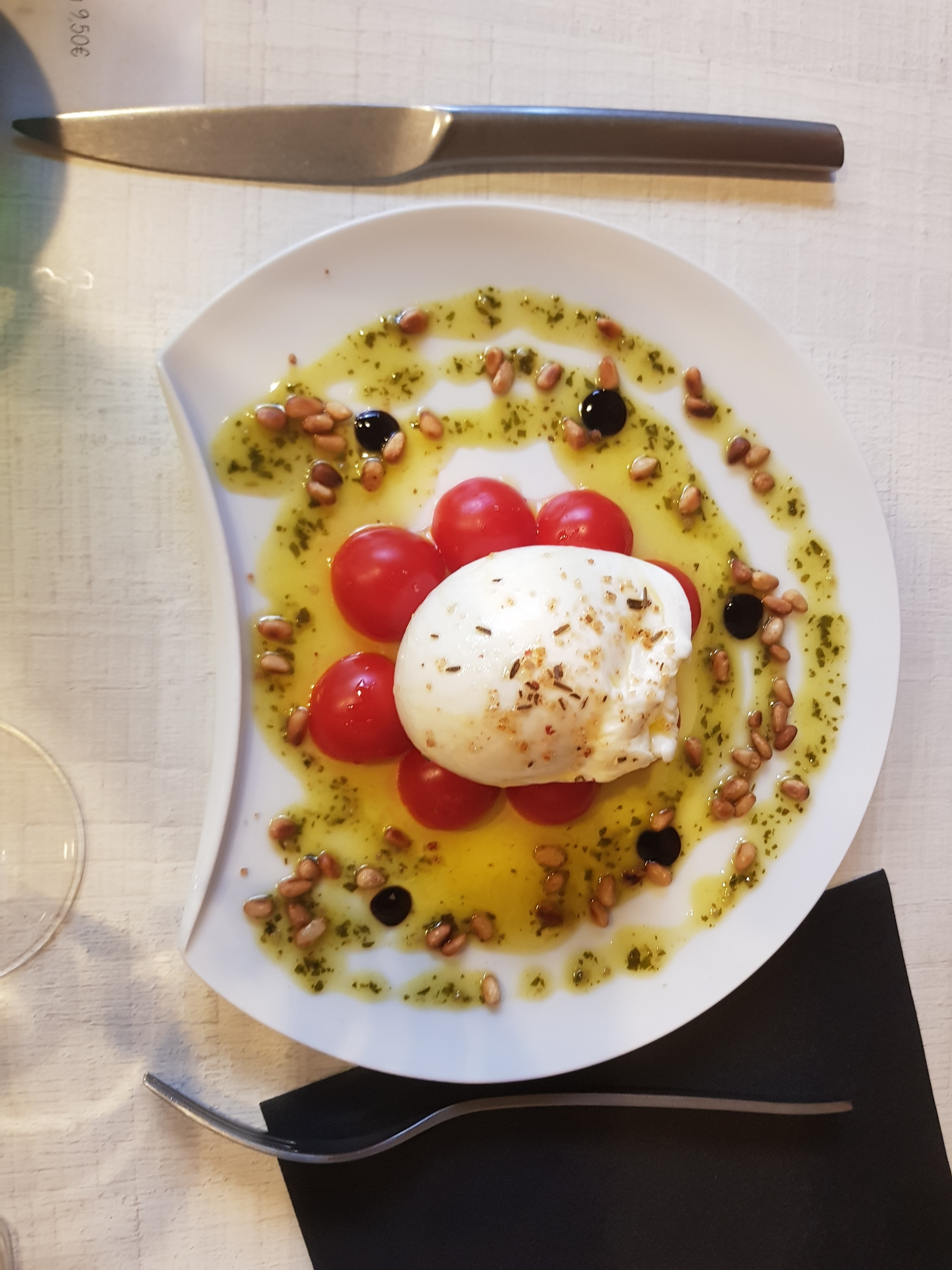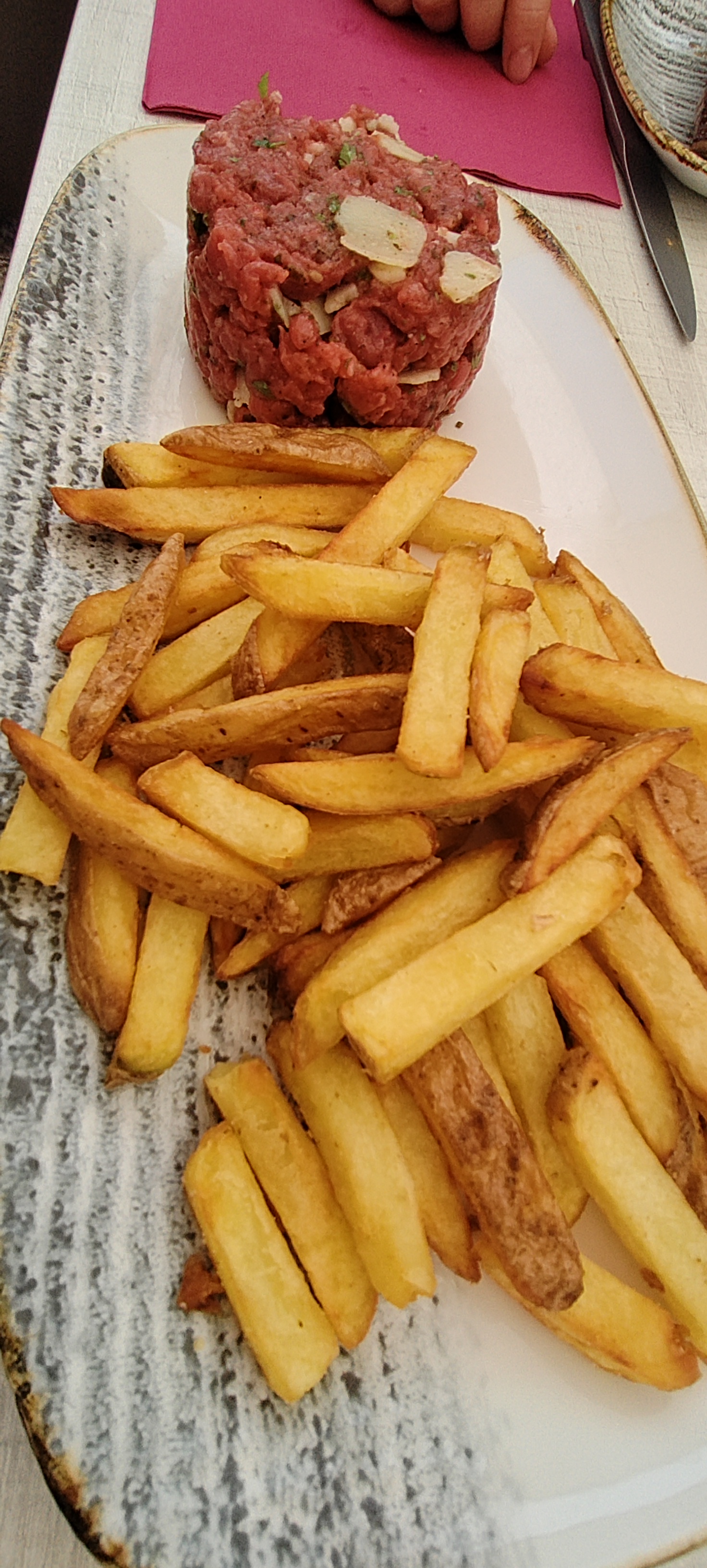 Accueil tres agreable, service parfait, assez rapide mais pas trop. Nous avons déjeuné dans la cour arriere, bien protégé par les parasols alors qu'il faisait 34°. J'ai pris un tartare à l'italienne, ma femme des tomates fraiches de saisons avec une burrata, et 2 menus enfants (brochettes de boeufs bien cuites et bonne viande tendre). Frites fraiches et délicieuses. Menu simple mais bon, pour un midi lors d'une visite, c'etait parfait. Nous recommandons.