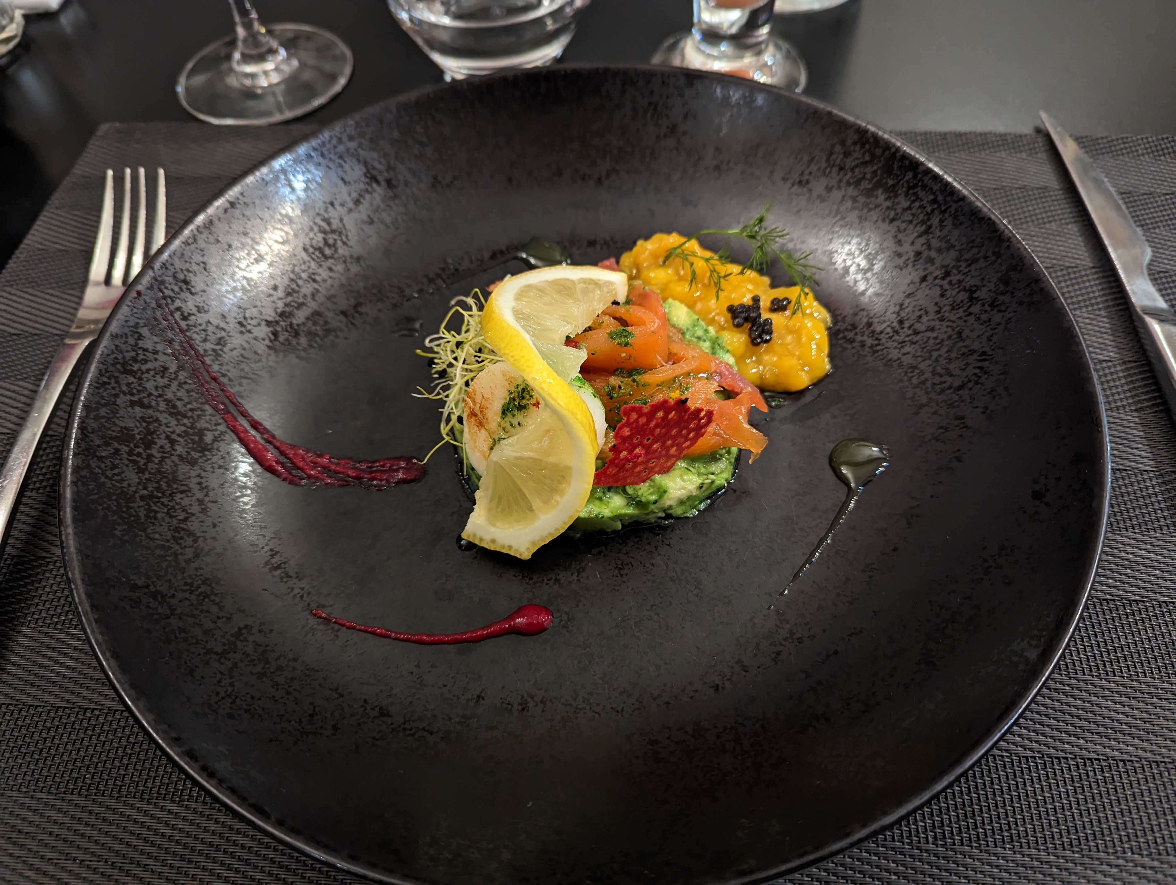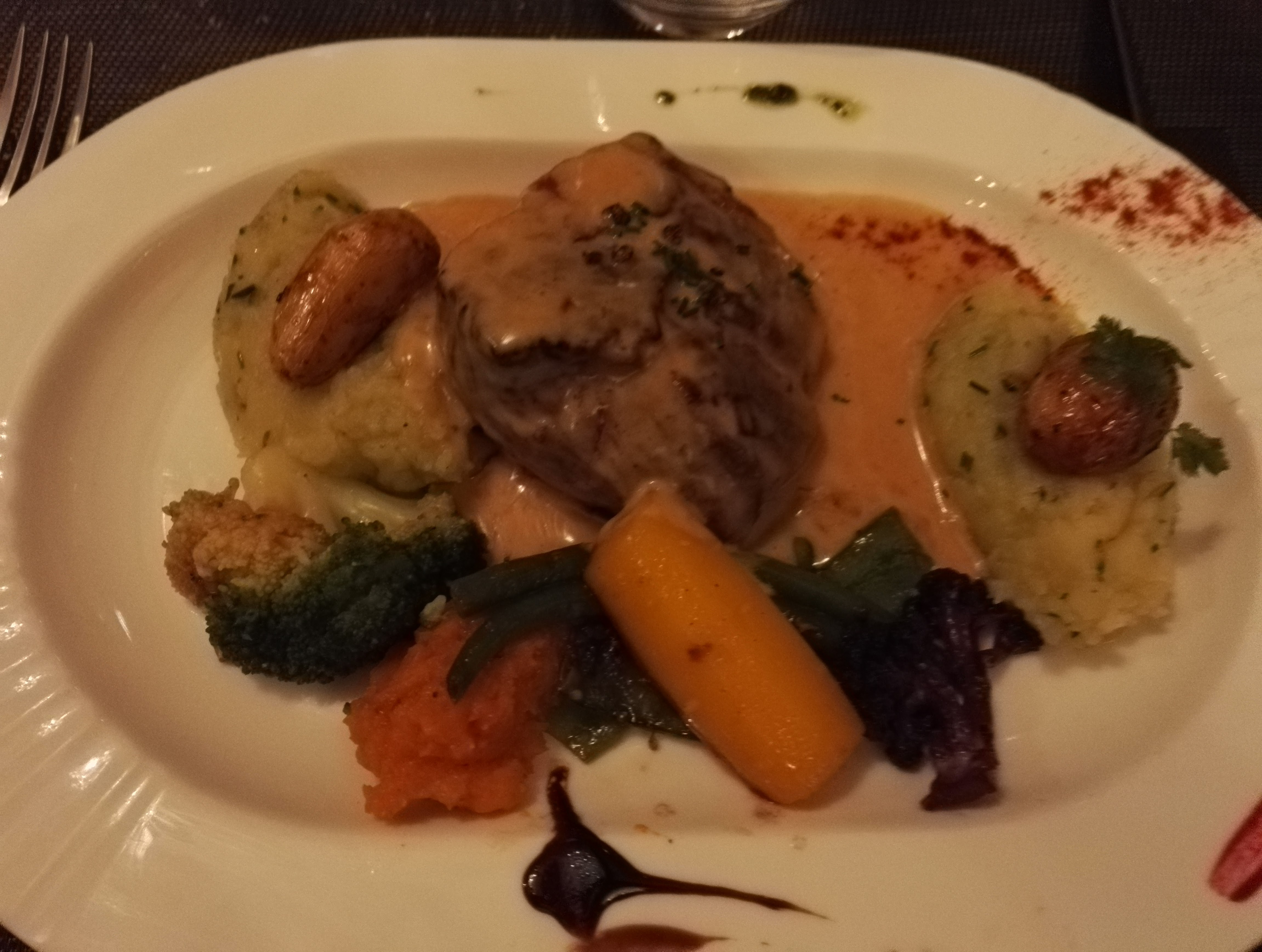 C eut pu être très bien , carte alléchante. Filet de bœuf cru à l intérieur, le filet de bar à la vanille est très bon mais tout le reste des accompagnements est très sucré ( riz et flan carotte ) bref cela donne un plat sans saveur différente que du sucré , le risotto ressemble a un riz au lait ! Bref globalement très déçu pour un prix très onéreux.