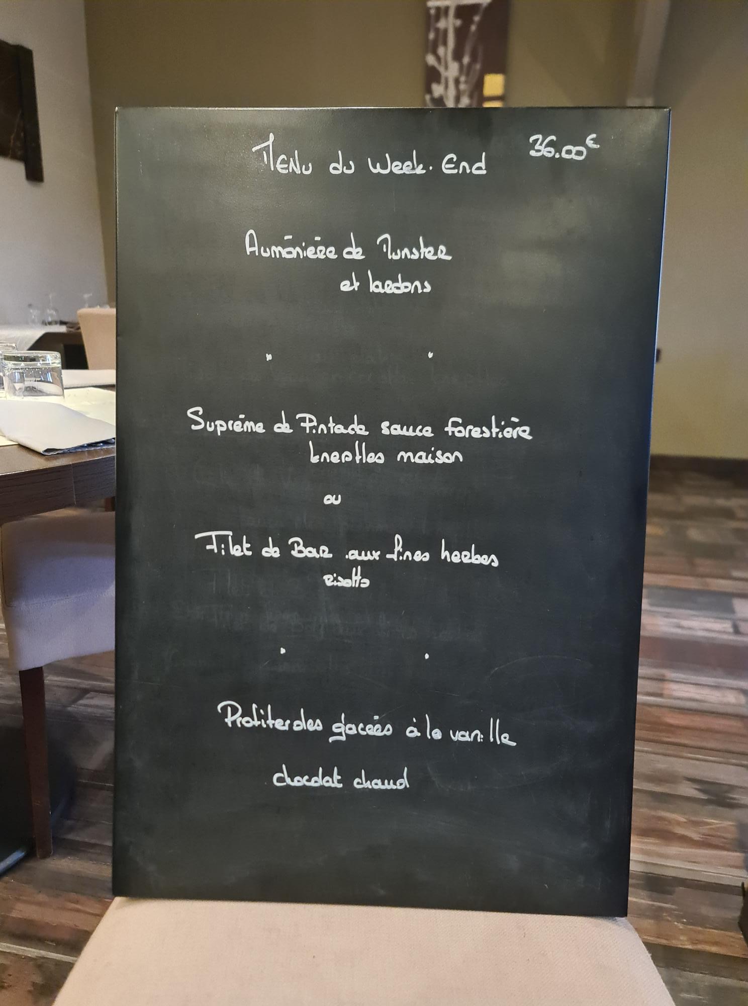 Première visite nous avons pris le menu du week-end comportant une entrée , un plat ainsi que le dessert. C’était Très bon et très chaleureux merci on reviendra