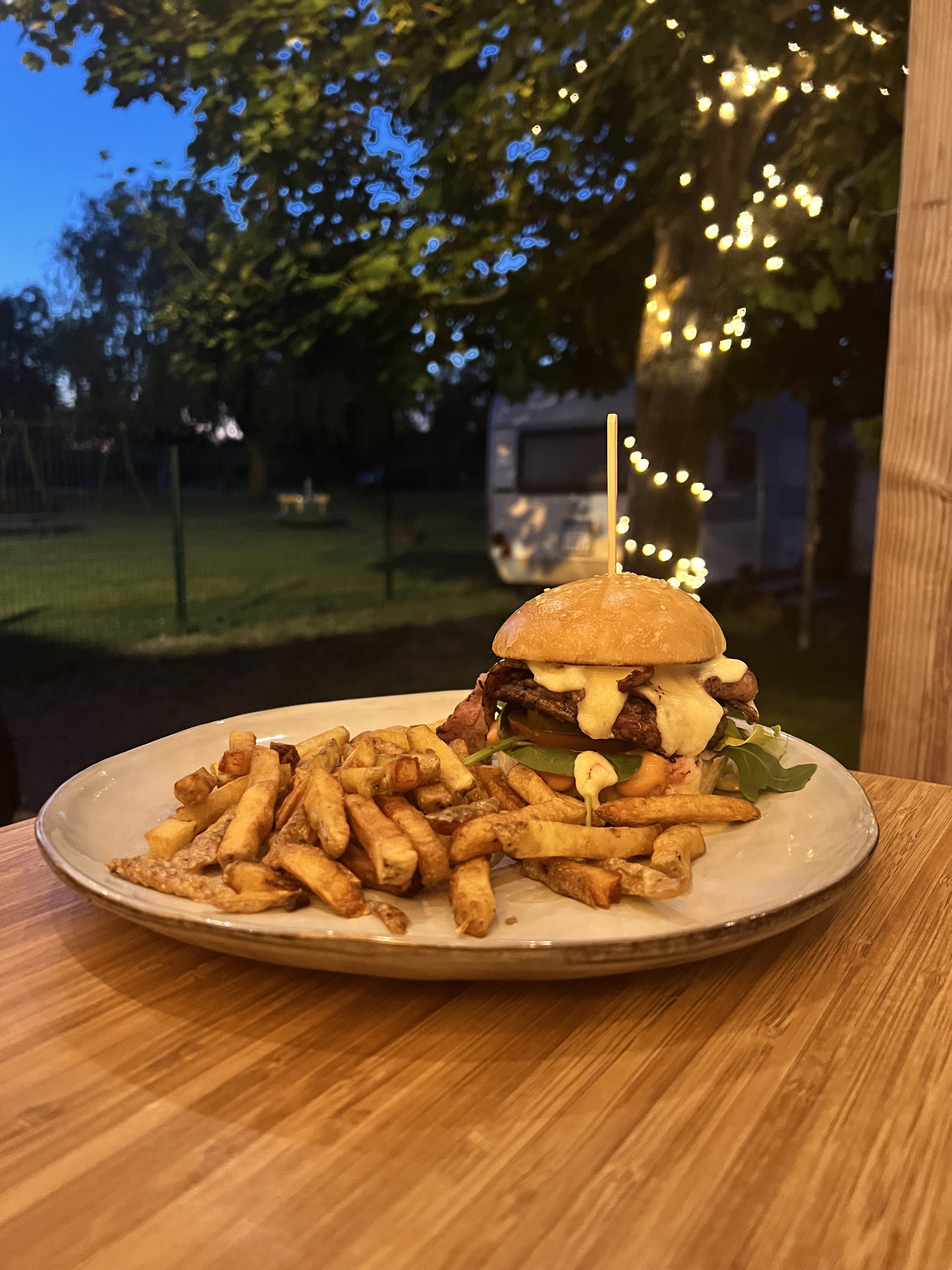 Lieu très sympathique qui se situe dans le camping avec un lac pour se baigner et un grand air de jeux pour les enfants. Restaurant très cosy avec sa grande terrasse en bois. Les serveurs et serveuses sont très sympas et mettent l'ambiance avec le DJ. Sur la carte il y a quelques entrées, 3 plats froids, 3 plats chauds, un repas pour les enfants et des desserts. Très bons produits