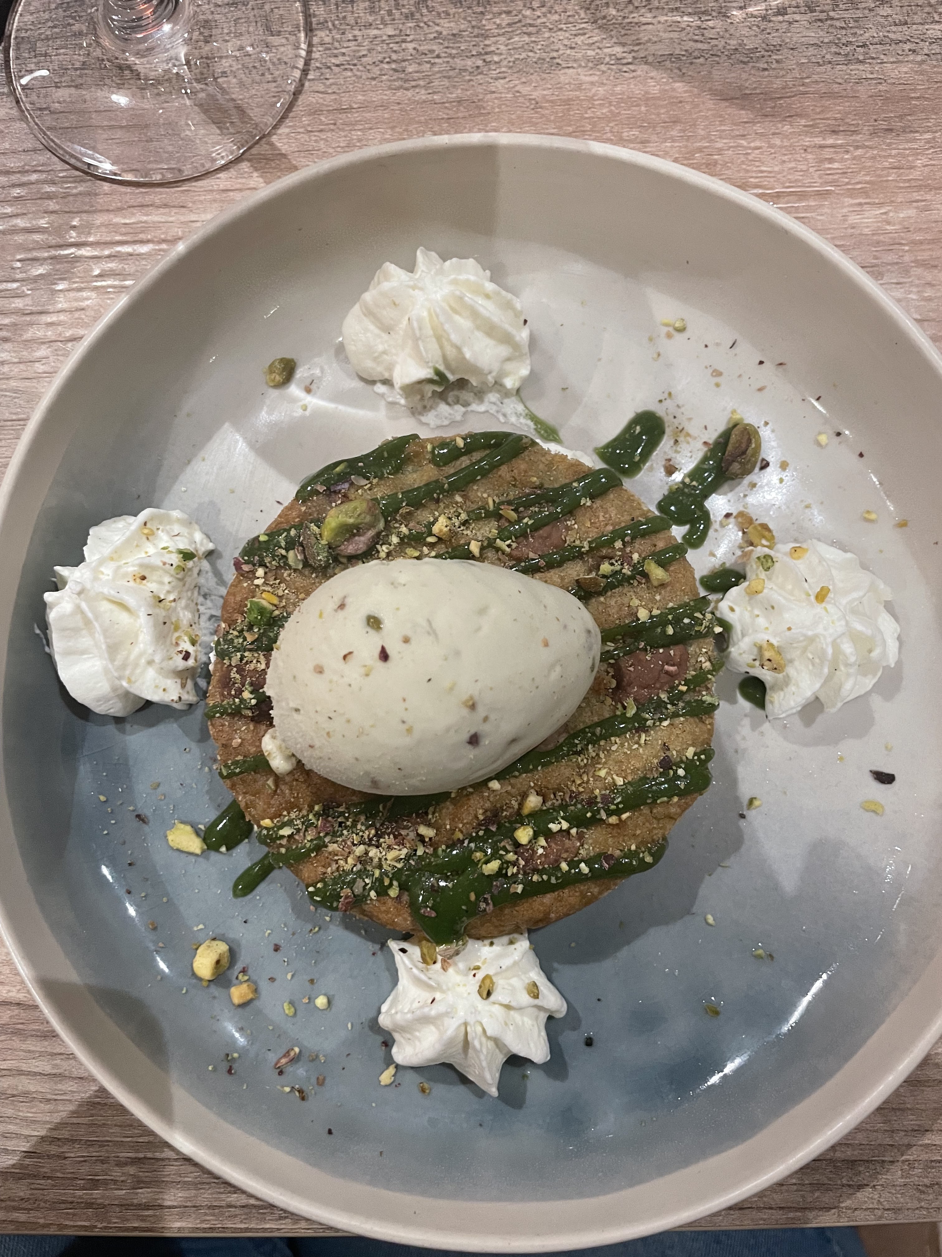 Nous nous sommes régalées ! Le service était très rapide. Petite tapenade offerte à l’apéro. Portions généreuses. Cuisson du veau parfaite et gros coup de cœur pour le cookie à la pistache !