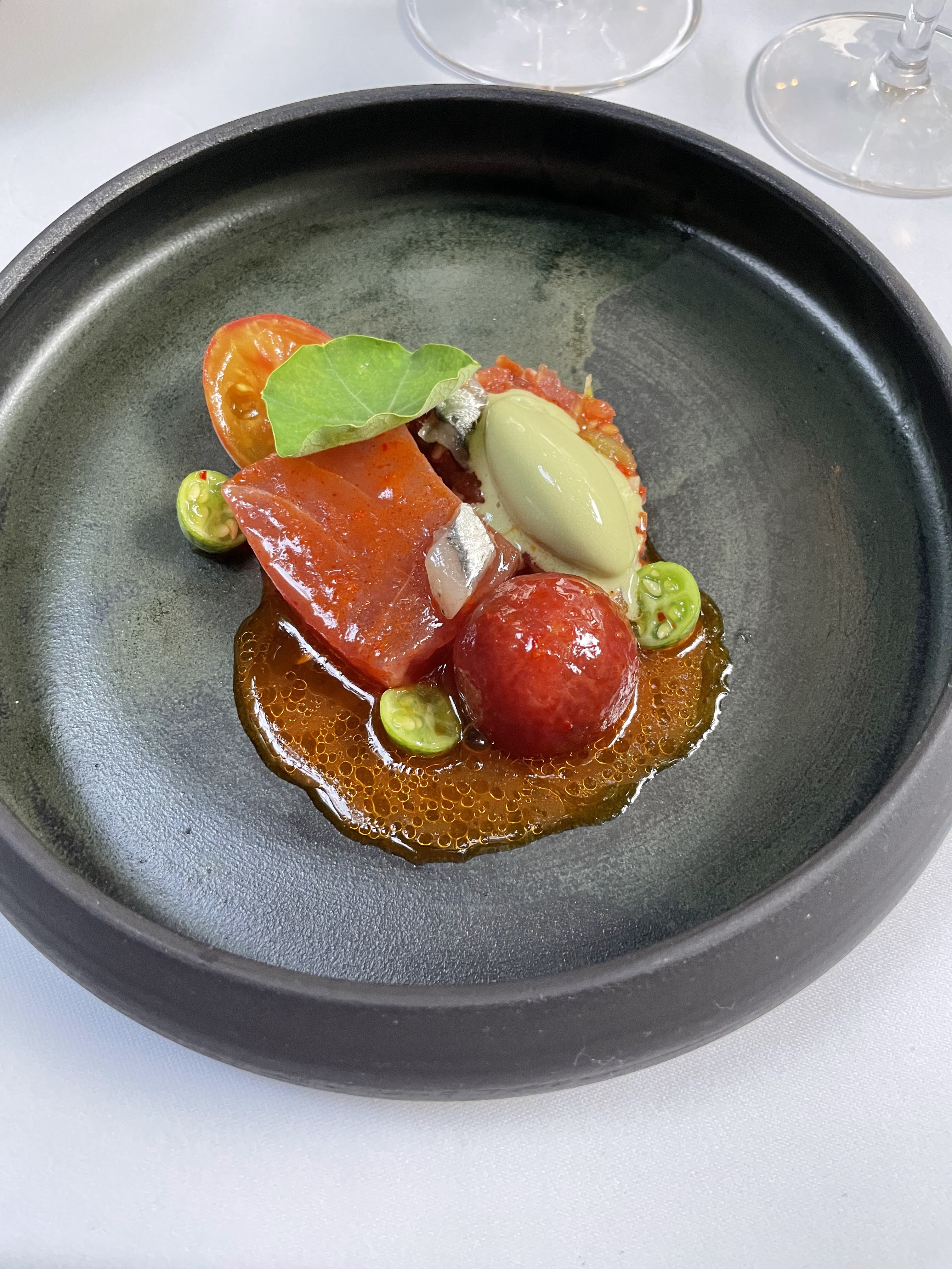 Nourriture vraiment tout à fait époustouflante. Nous avons eu le menu dégustation de 6 plats et c'était superbe : des combinaisons de saveurs délicieuses, délicates et incroyables. Surpris, il n'a qu'une seule étoile Michelin - attendez-vous à ce qu'une deuxième et une troisième suivent. Je ne pourrais vraiment pas le recommander davantage.