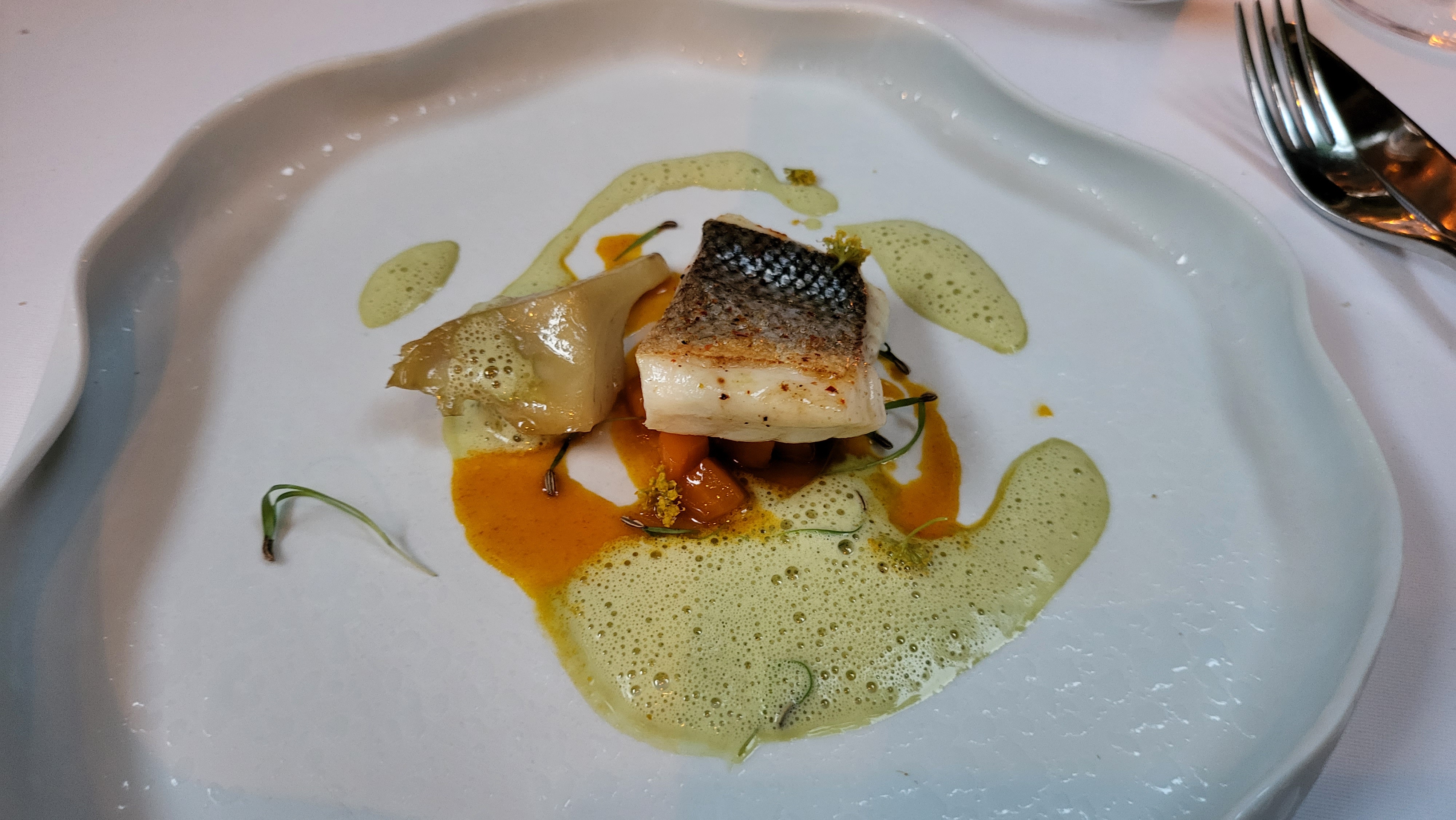 Délicieux...originalités... Juste mini bémol....trop de sauce à l'oignon doux autour du loup de mer qui lui est divain mais fait disparaître totalement le goût de l'epinard et de la lentille