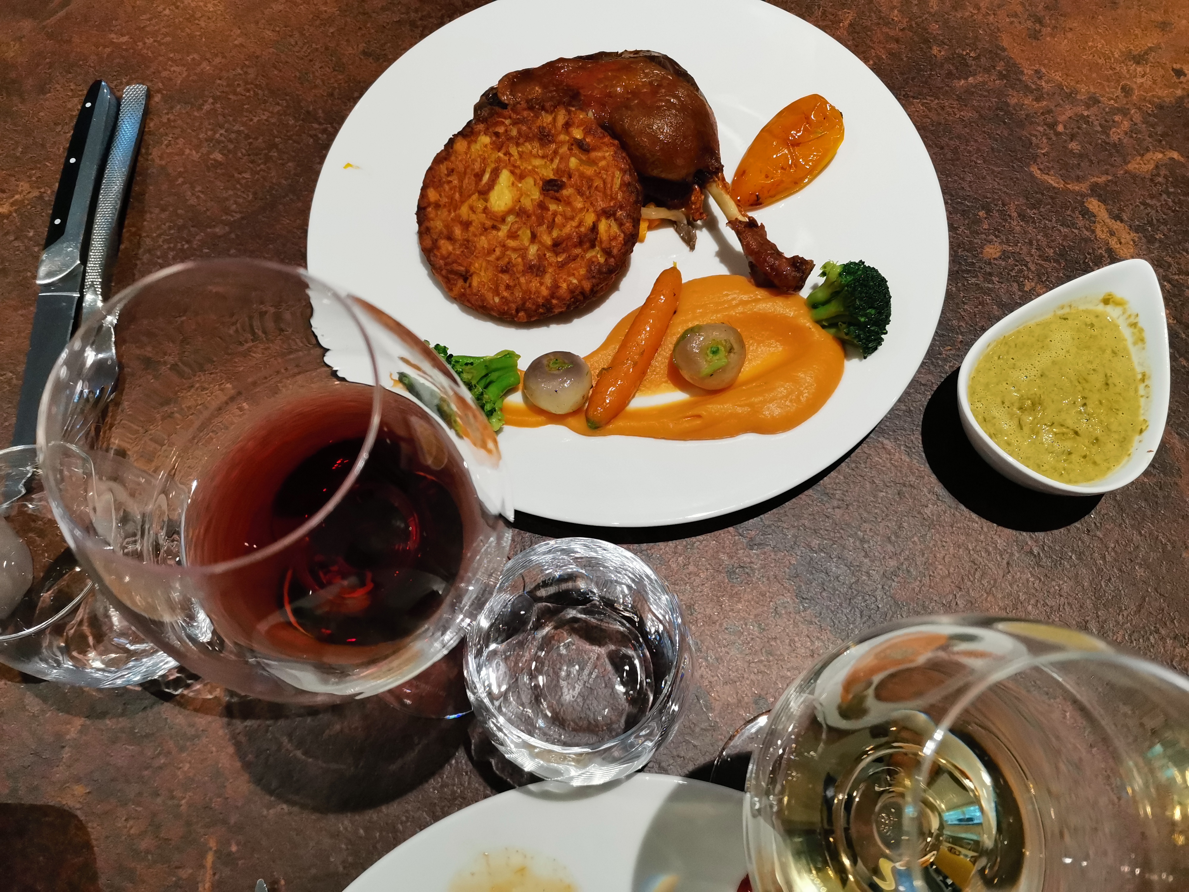 Vraiment trop cher pour ce que c'est. Repas le plus cher de France depuis plus d'un mois et nous avons vraiment bien mangé. Il n'y a rien de mal avec la nourriture mais rien d'enthousiasmant. Aucune ambiance. Le personnel a été précipité et on ne nous a pas offert de dessert alors que les tables autour de nous l'étaient et ils ont commencé à débarrasser les tables et nous ont ignorés. Je ne dînerais plus là-bas. Si vous êtes à l’hôtel, c’est mieux que rien.