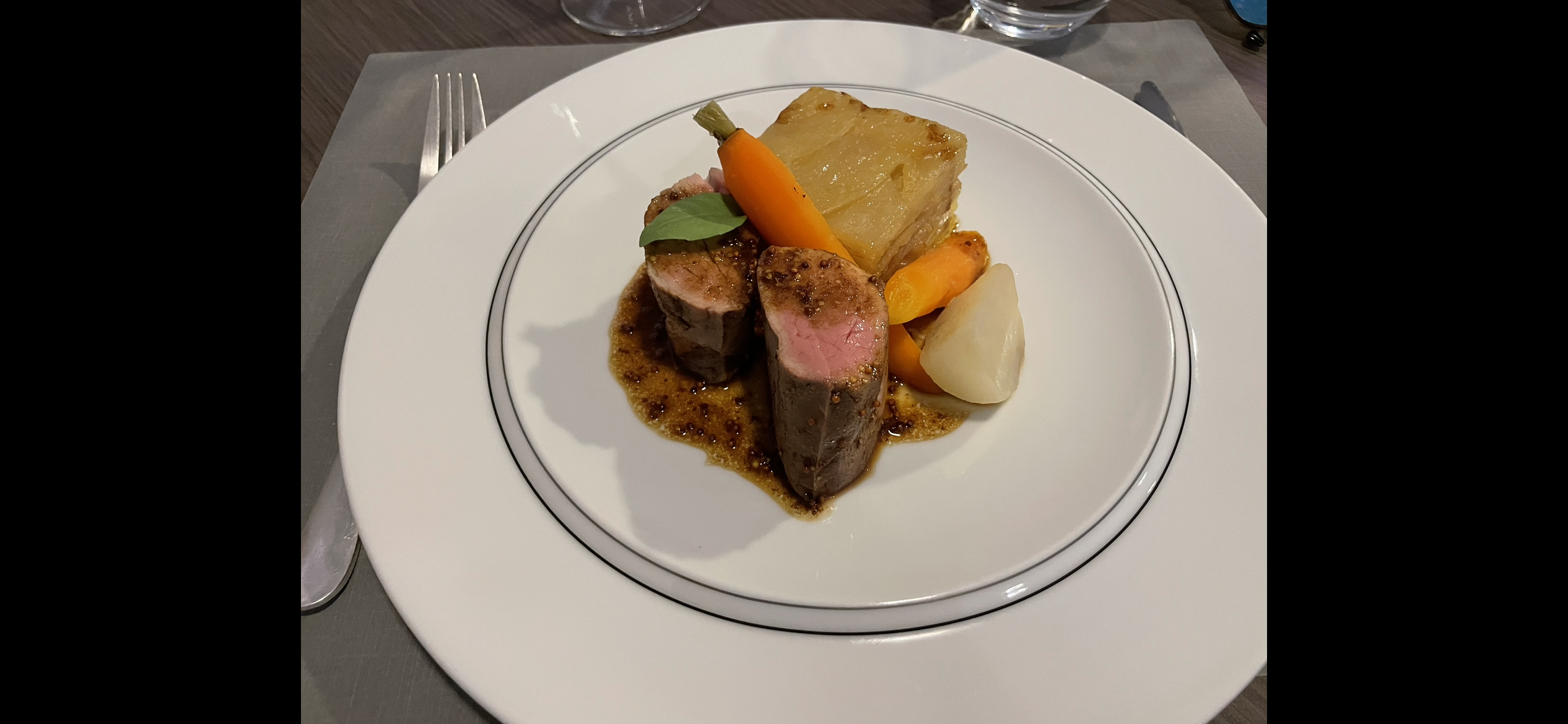 Bonne table, présentation soignée et délicieux repas autour d'une pièce de bœuf à la truffe d'été. Un gratin de framboise et une poire rôtie à la lavande pour finir avec une note de sucré. Je recommande...