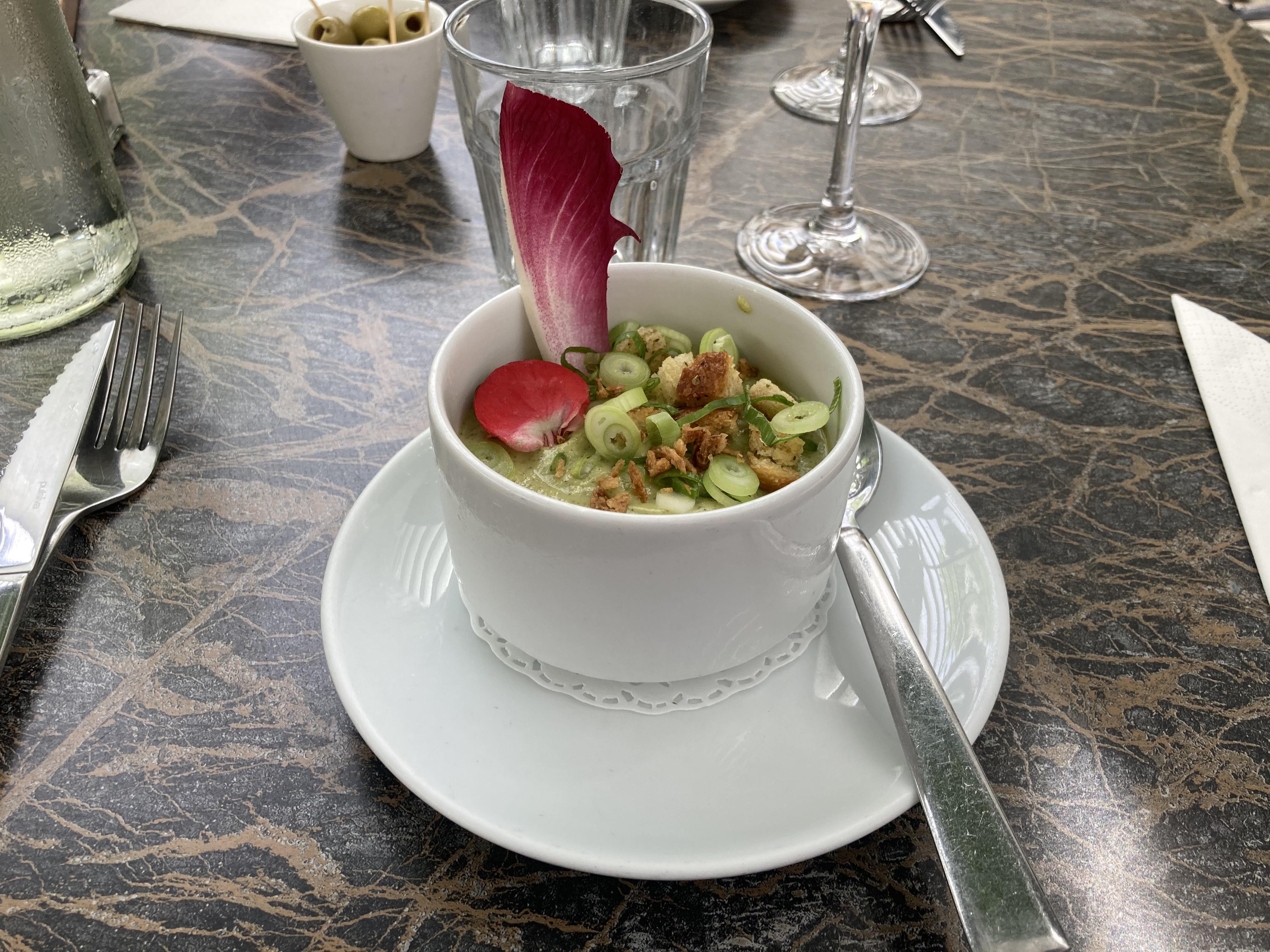 Très bonne surprise Avec une terrasse très très agréable le service est top et les plats sont bons surtout le gaspacho de courgettes un régal . À faire absolument 👍