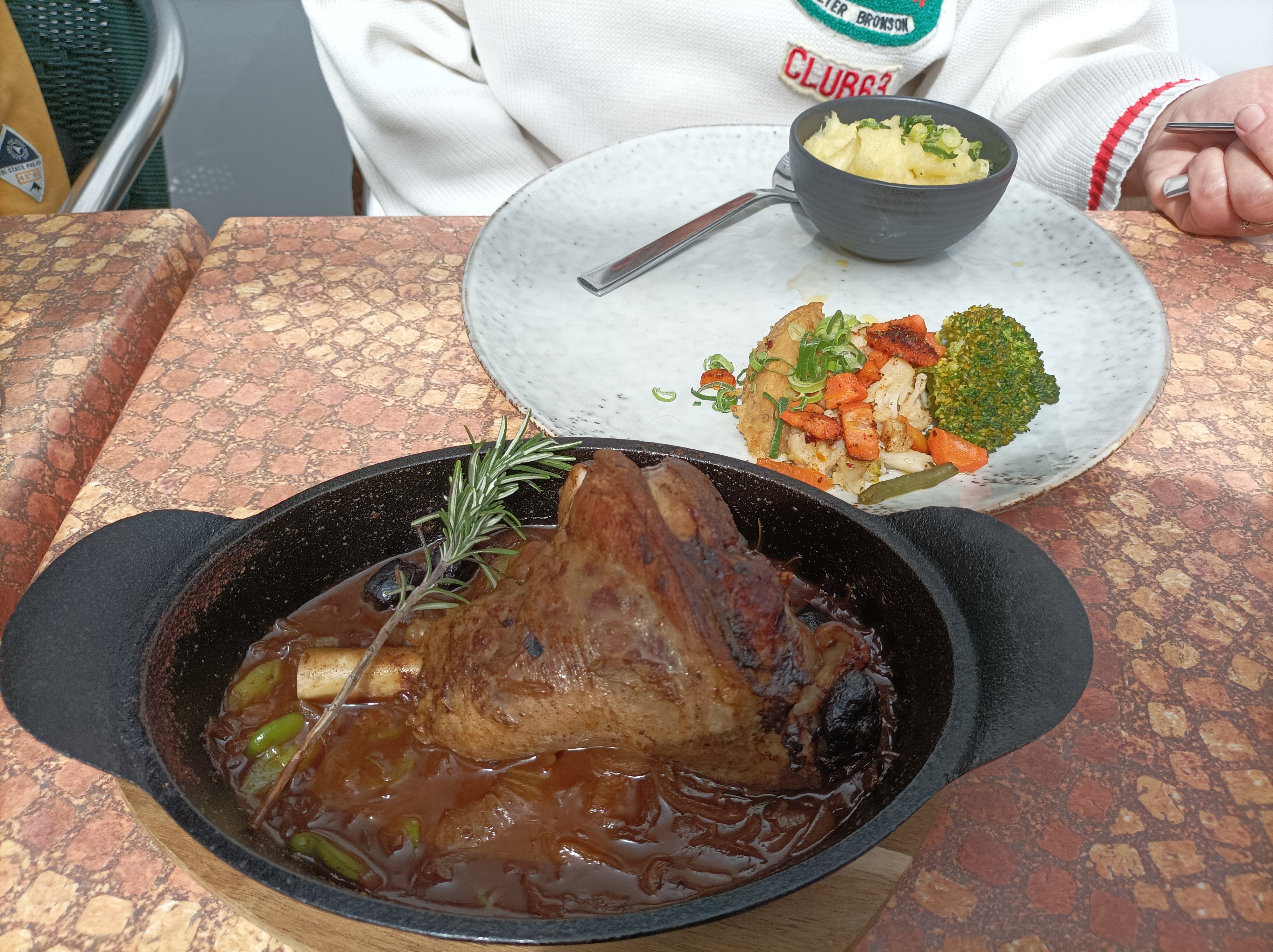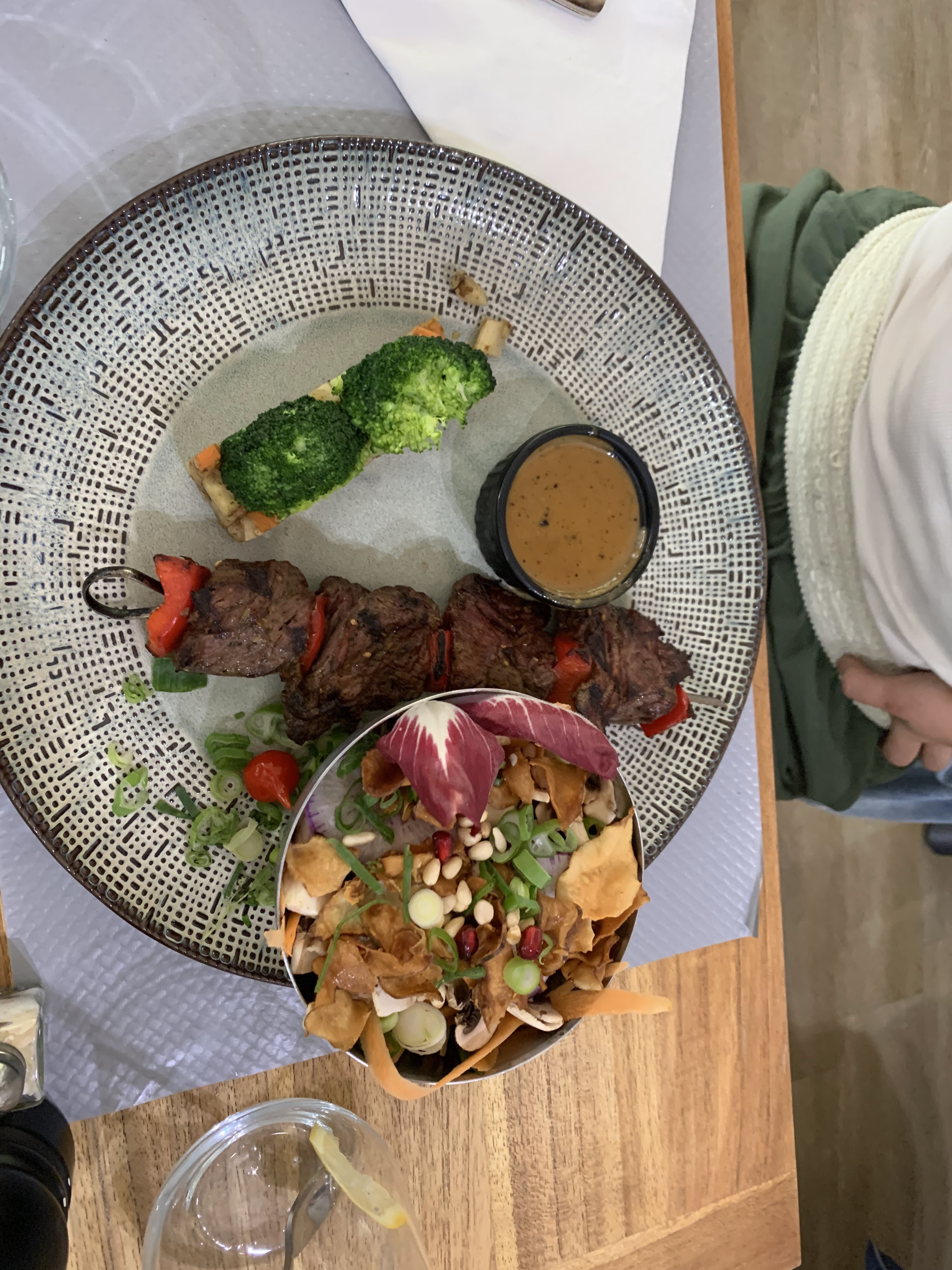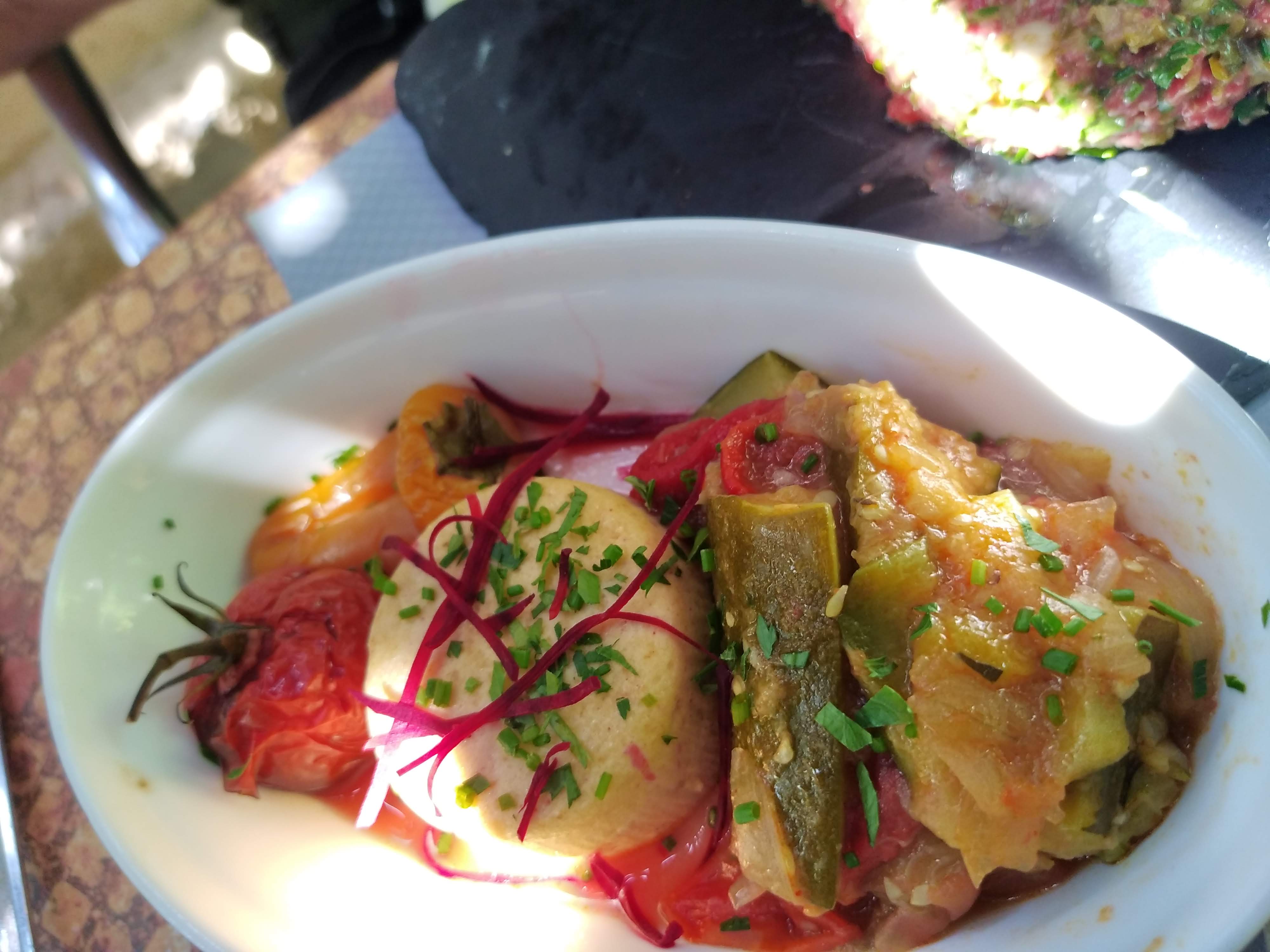 Dans un magnifique jardin rafraîchi par une brume, déjeuné excellent avec des mets délicieusement braisés. Service impeccable