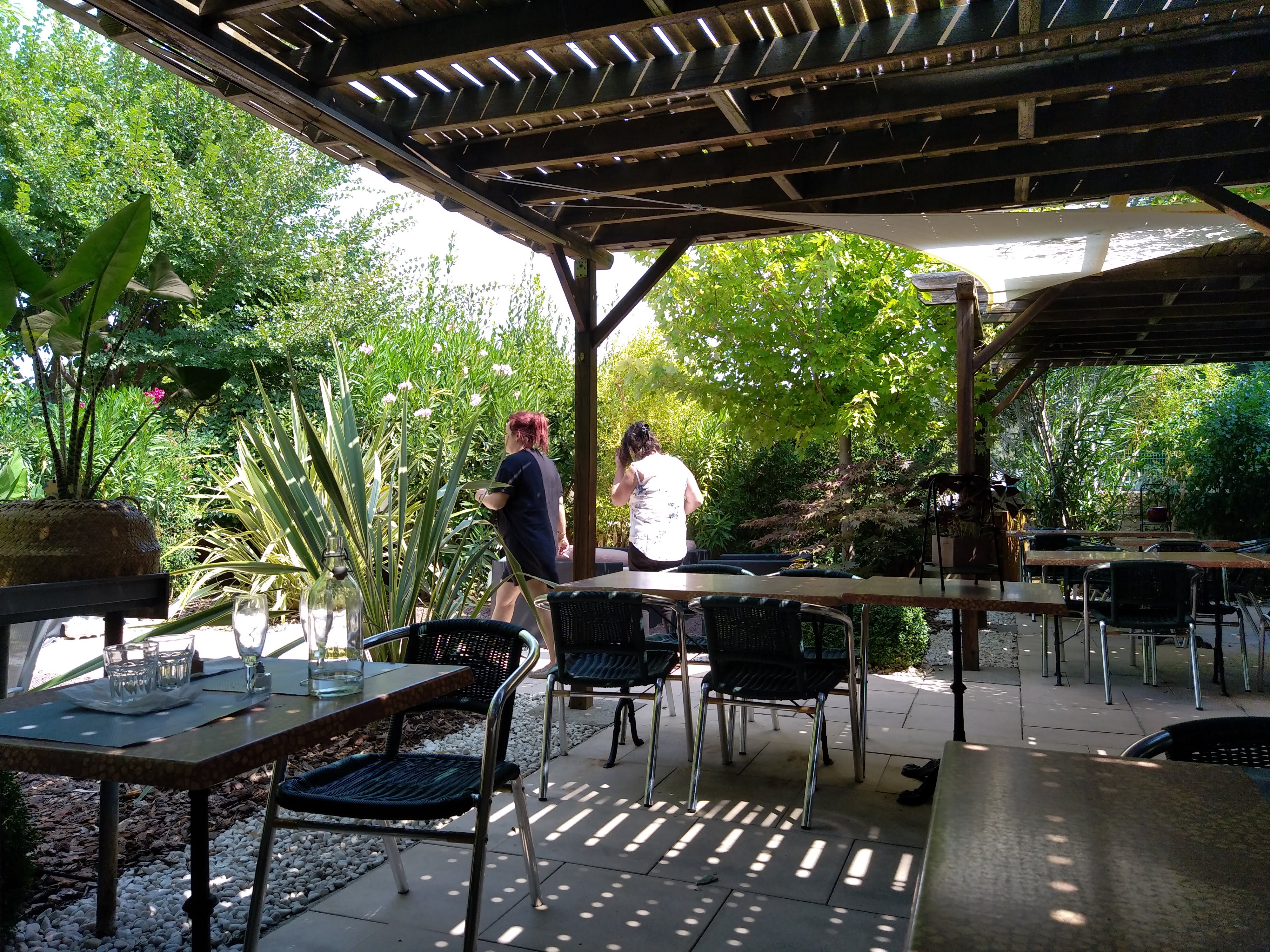 Un cadre sympa sous une tonnelle végétale et même si à fleur d'une rue, peu de nuisance sonore. Très bon rapport qualité prix et les serveuses sont très pro en plus d'être agréables et très souriante. Arrêtez vous à cette adresse pour une pause gourmande