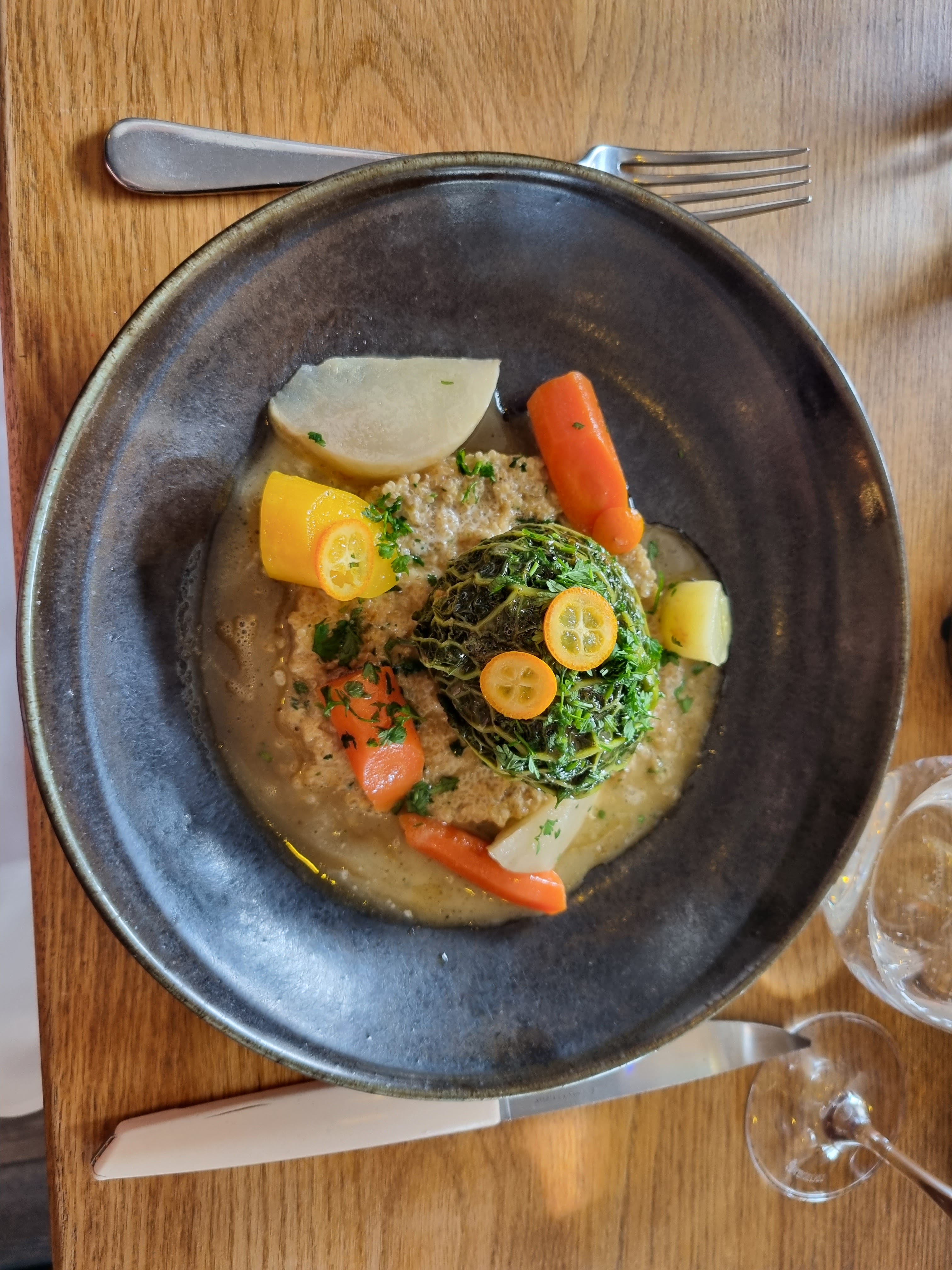 J'aime beaucoup ce lieu mais j'ai quelque peu été déçue de mon dîner hier soir. Leur plat végétarien signature, le fameux quinoa n'était pas assaisonné avait très peu de goût. Il était servi avec une aubergine au four ... qui n'était pas cuite ! Quand mon assiette a été débarrassée avec l'aubergine encore crue, j'ai expliqué pourquoi et on m'a juste dit je remonte le message en cuisine. Quant au dessert, la 'mirabelle', je m'attendais à un dessert raffiné et acidulé, en fait il s'agissait de quelques mirabelles baignant dans une épaisse crème. De plus, je n'avais pas tout à fait terminé mon verre de vin quand on me l'a enlevé. J'étais accompagnée et n'ai pas voulu souligner tout cela, si j'avais été seule, je me serai permise.