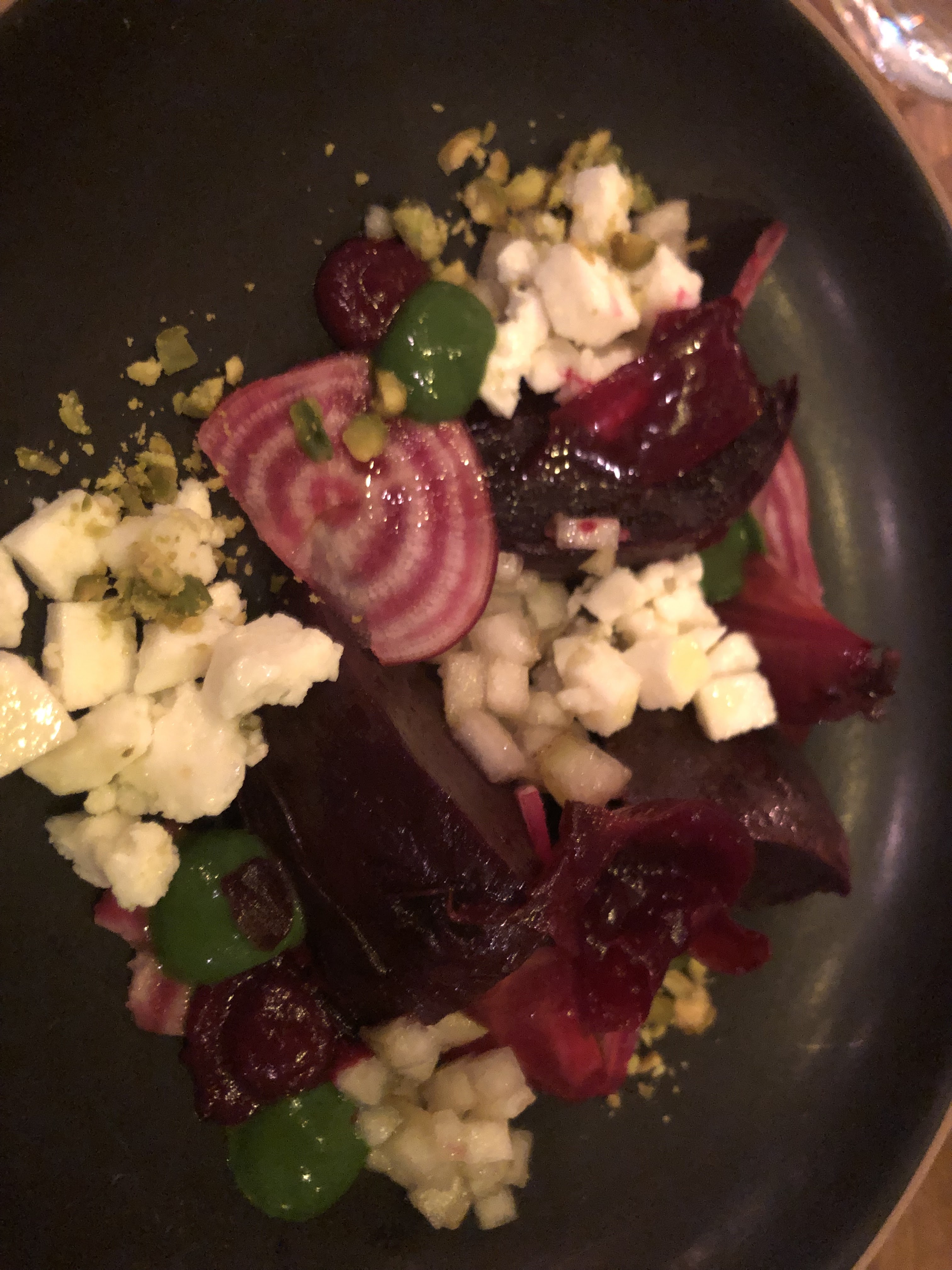 Bilan mitigé pour ce restaurant où je me rends pour la 3e fois. j'avais eu l'occasion d'apprécier la finesse des plats et des goûts mais cette fois je suis resté sur ma faim pour plusieurs raisons. Un temps d'attente déraisonnable entre chaque plat surtout pour la pause déjeuner et surtout quand il n'y a en tout et pour tout que 9 personnes dans le restaurant. Entrés à 12h30 ressortir à 14h, c'est non. Ensuite, l'entrée (betterave) n'est pas mauvaise mais pas hyper convaincante non plus. Le plat est lui très bon avec de belles saveurs et textures et une viande parfaitement cuite mais dans des portions vraiment légères même quand on est pas un gros mangeur. Le dessert plutôt réussi aussi mais on a pas vraiment eu le temps de le savourer. En bref, une expérience culinaire plaisante mais pas parfaite surtout compte tenu du prix et un temps d'attente vraiment anormal (peut-être y avait-il un problème mais nous n'avons eu aucune explication sur le sujet). Des défauts qu'on pardonne plus facilement quand l'addition est moins élevée...