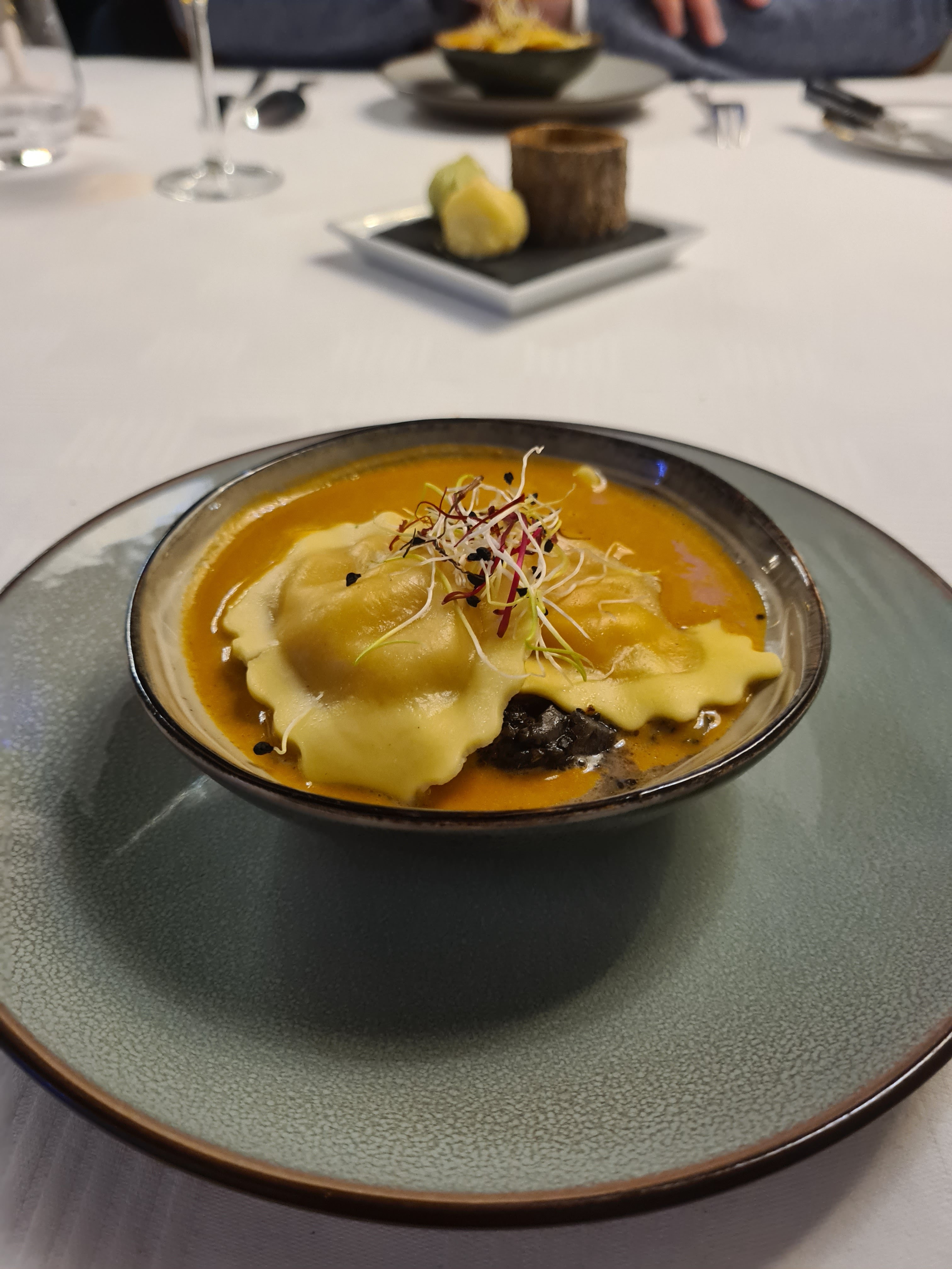 Très bon service, beaucoup d'efforts ont été déployés. La nourriture était vraiment créative. Certains plats pourraient être plus assaisonnés, d'autres pourraient être fades. Beaucoup de plats à la crème, c'était le plus gros problème, nous étions trop rassasiés après 6 plats. Nous n'avions pas fini la bouteille de vin à 80 euros et malheureusement on ne nous a même pas demandé si nous voulions l'emporter avec nous. Malheureusement, le poulet était sec. Dommage. Il y avait des plats très créatifs et savoureux, d'où les 4 étoiles, le restaurant est très joli à l'intérieur, bâtiment très ancien. Dans l’ensemble, ce fut une soirée calme, chaleureuse et savoureuse. Malheureusement, il ne se passait pas grand-chose, nous sommes restés assis presque seuls avec un autre couple toute la soirée. Cela ne m'a pas dérangé.