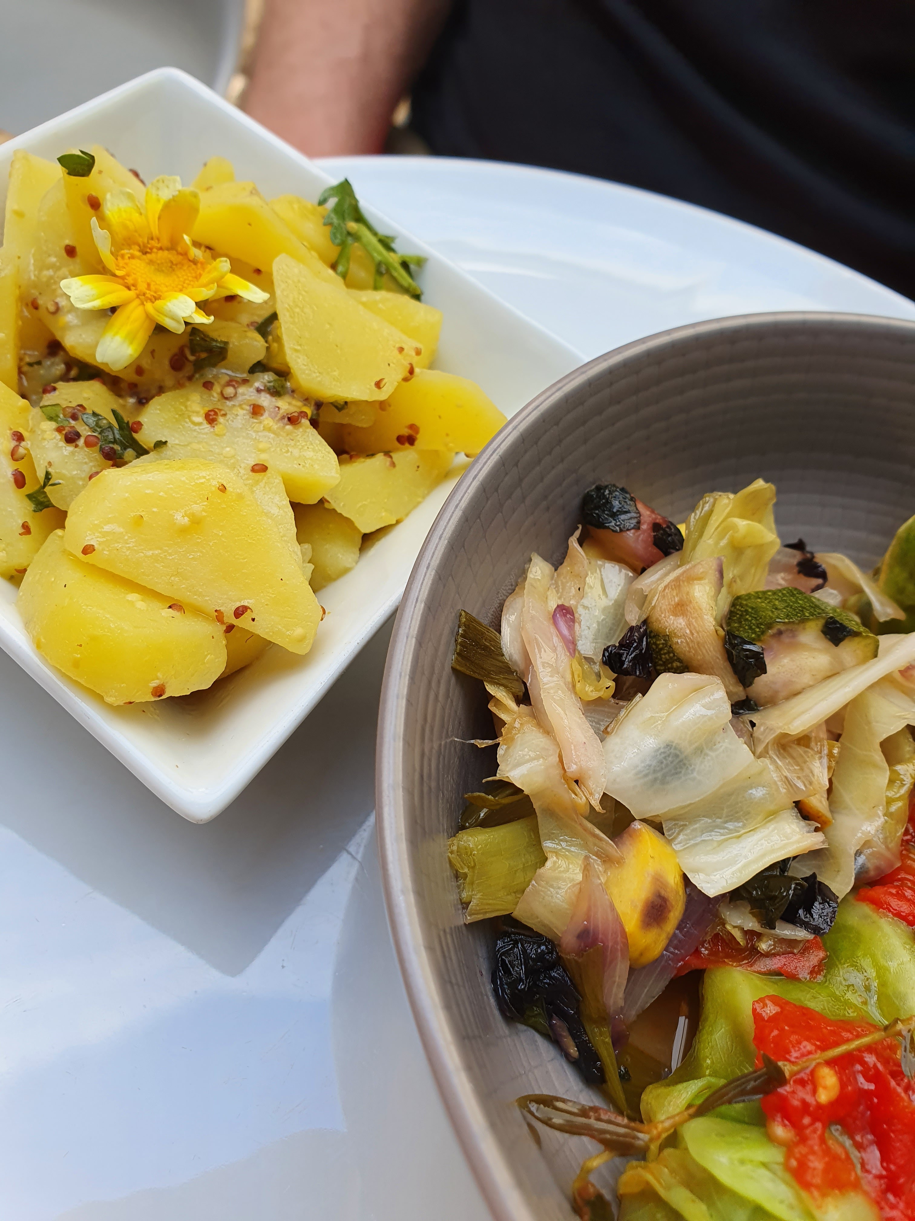 Très déçues. Nous avons réservé pour le déjeuner trois personnes. Le lieu est agréable mais le choix limité. Nous avons choisi les ravioles au poulet. Elles étaient sèches le poulet porté disparu. Les pommes de terre à l ail des ours n en avaient pas le parfum et les légumes crus comme la carotte étaient mous. L une de nous a pris un plat vegan mieux cuisiné à la maison. Conclusion la cuisine est un métier que ne maîtrise pas la patronne. Le tout est cher 16 euros le plat 8 euros le verre de vin. Nous ne reviendront pas.