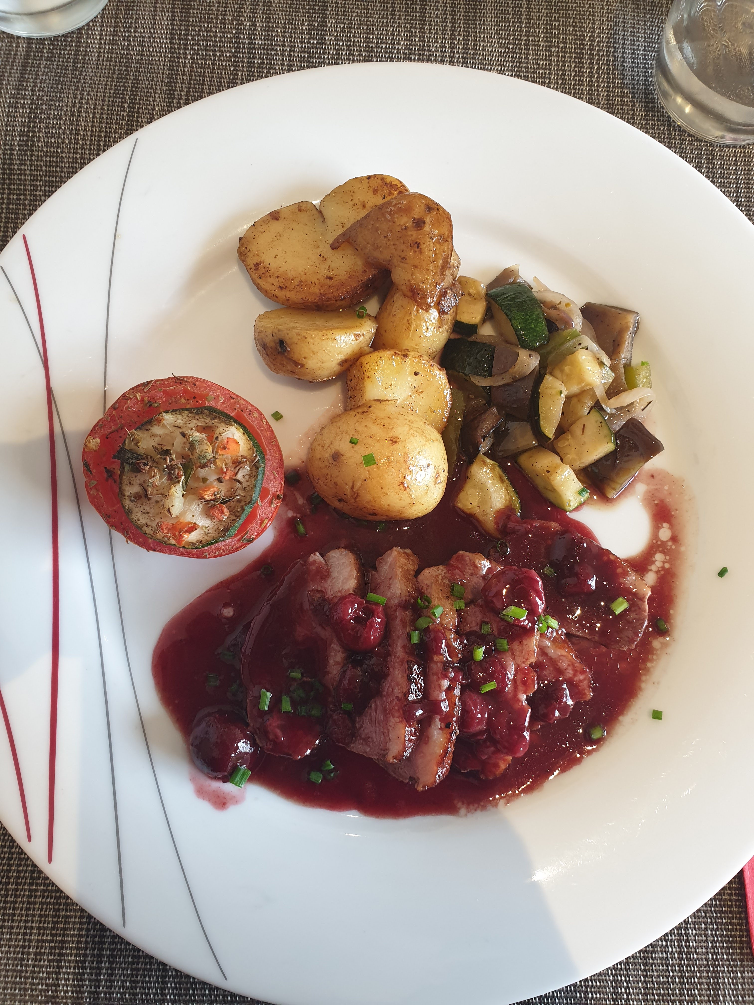 Entrée fricassée de crevettes : c'était quelque chose de torsadé, insipide, ça n'avait pas la forme d'une crevette. Et ça baignait dans une sauce qui elle n'était pas mauvaise. Donc torsades à la nage . Ensuite filet de canard, la cuisson en était parfaite. L'accompagnement.... Innommable. Les galettes de pommes de terre décongelées grises tellement elles avaient attendues et bien trop cuites. La petite purée de légumes asséchée sur le dessus à dûe rester à l'air des heures... Bref grosse déception, à ne pas refaire. La première serveuse pas un sourire... Ensuite la patronne, beaucoup plus agréable heureusement