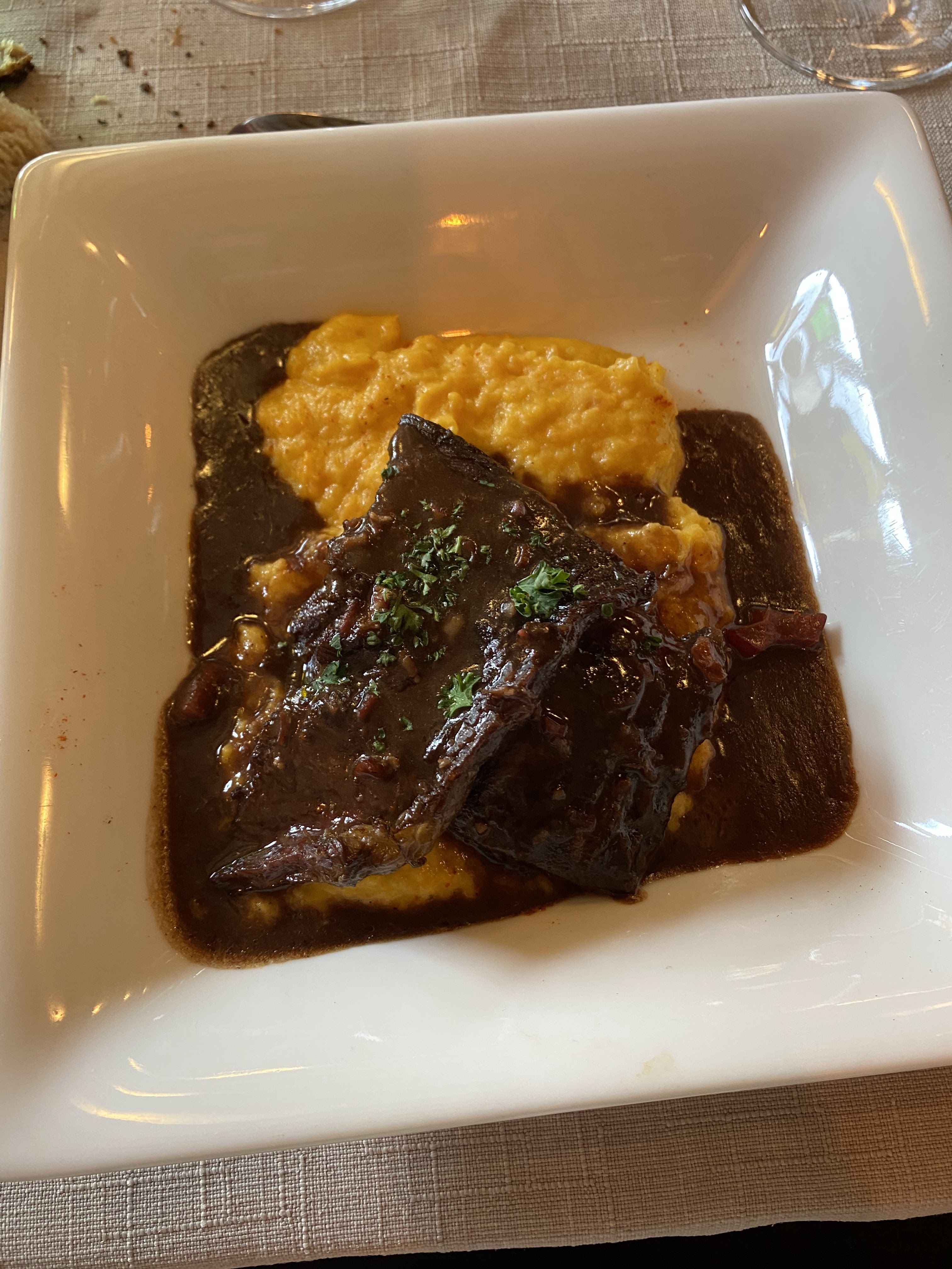 Notre dîner était bon. La serveuse était serviable, mais pas entièrement chaleureuse. Ce n’est pas grave. Le vin était bon et la nourriture était au-dessus de la moyenne. Il est ouvert le dimanche, donc c'était utile.