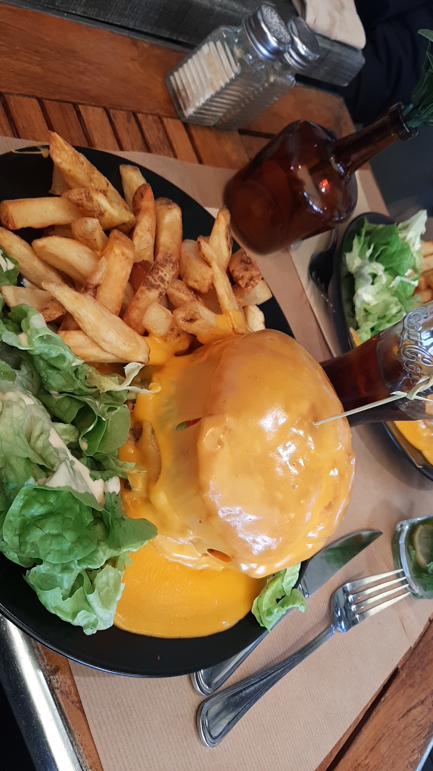 Un serveur très sympathique mais un peut spécial , repas très bon et copieux juste les frites était un peut grasse avec goût de L huile trop prononcé et trop cuite , sinon que ça soit le steak boucher ou le burger rien a redire . Le burger est comme je L aime , viande cuite comme il faut , cheddar bien fondu sur le steak et salade et tomade bien fraîche . Dans L assiettes , il pourrait y avais plus de salade ça serais top