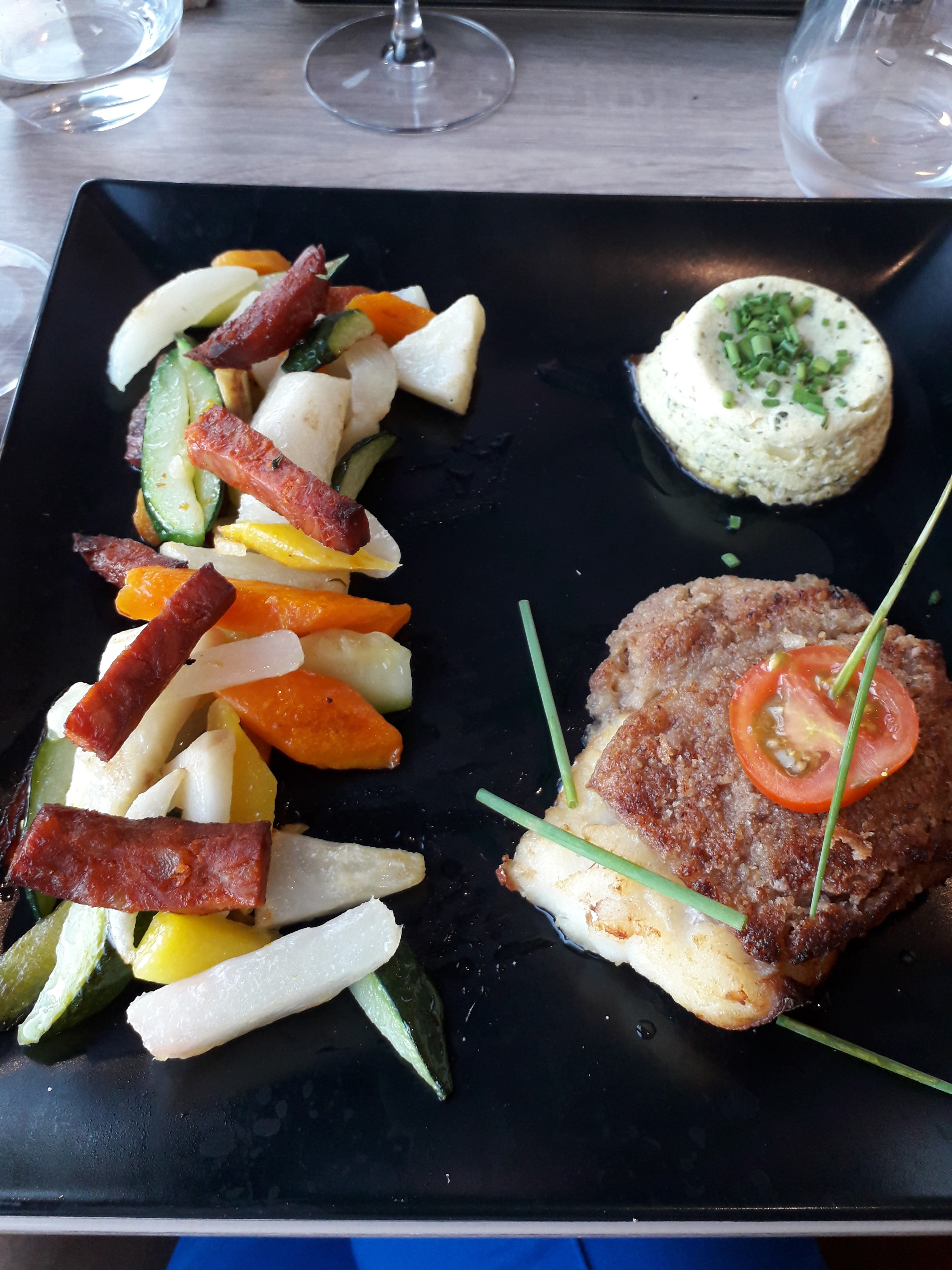 Déjeuner en couple le dimanche 23 août Très bien accueilli par l'équipe de salle nous avons choisi un menu tout poisson Salade de lentilles et truite fumé Filet de bar Les quantités sont correctes, joliment dressé et bon assaisonnement. Les lentilles auraient peut-être méritées d être rehaussé d un vinaigre pour donner un de peps. Deux bémols, service un peu long mais bon ont est en vacances et les serviettes en papier dommage pour ce style d établissement Je recommande ce restaurant