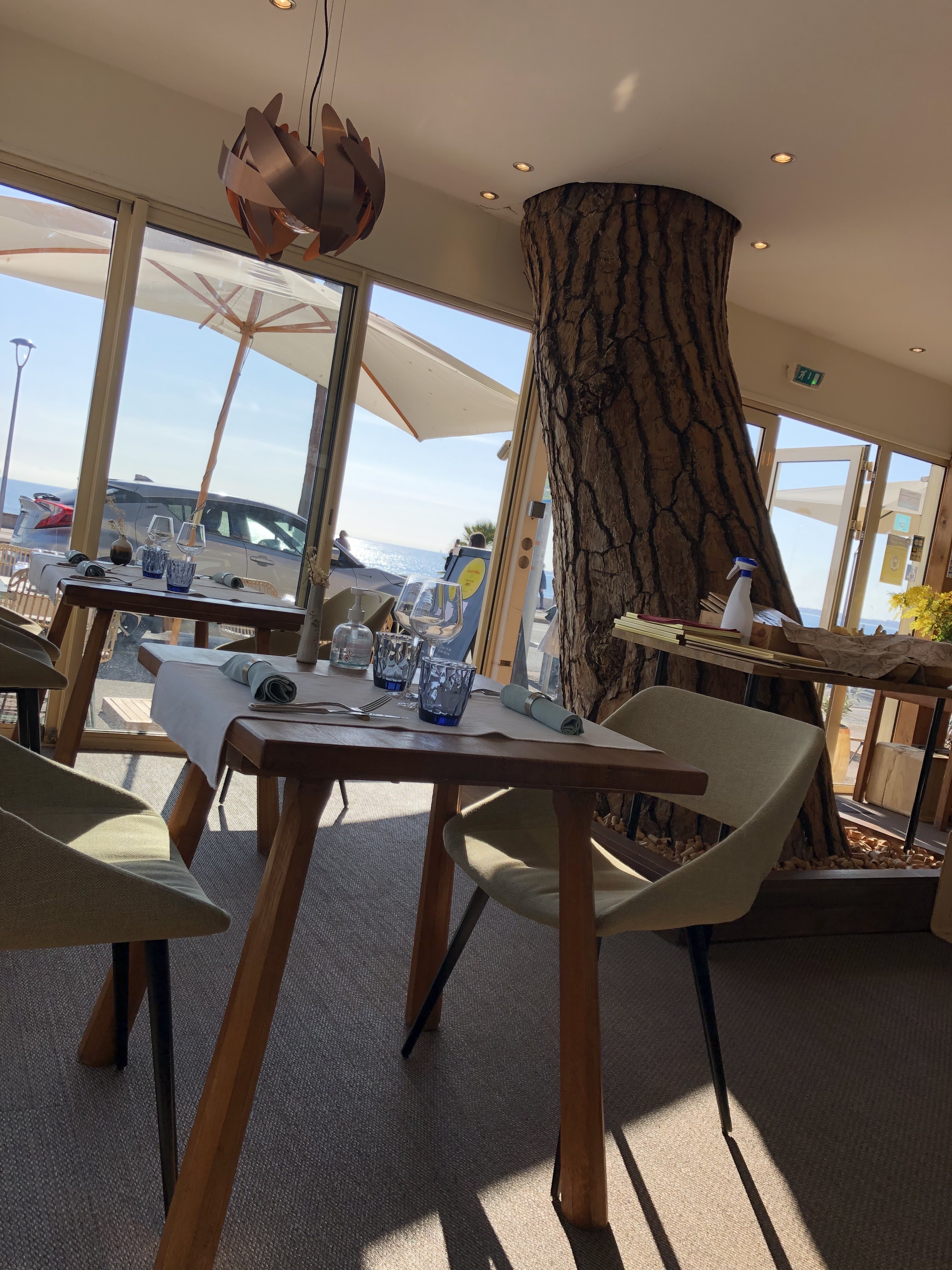 Belle découverte le long de la promenade. Très bon service, discret et professionnel. Beau cadre, très propre et original avec le tronc du pin maritime qui est préservé dans la salle même. Les plats sont bien présentés, cuisine sophistiquée, seul bémol ça manque un peu de condiments pour relever légèrement les produits proposés. L'établissement n'étant pas très grand une réservation est conseillée.