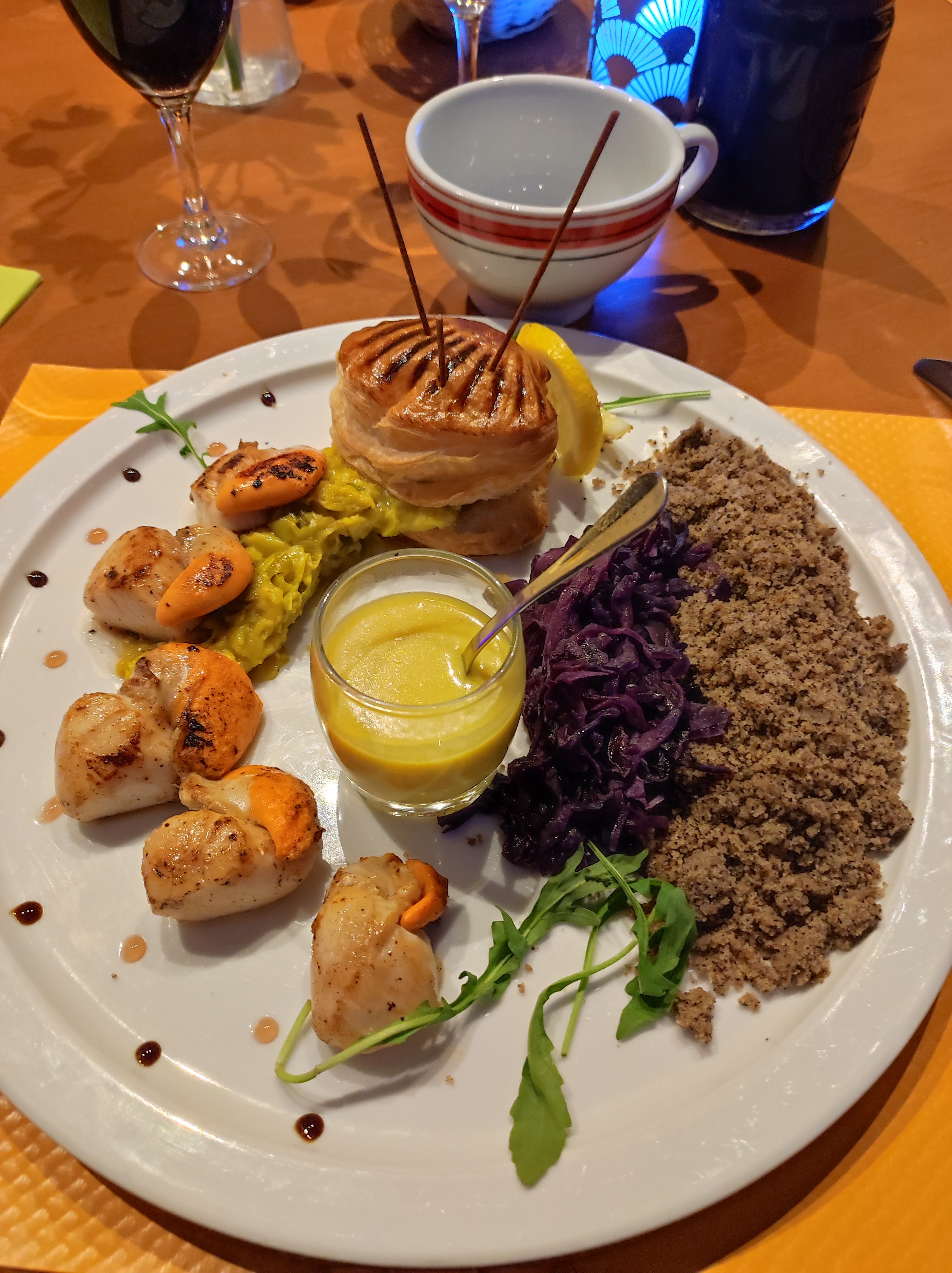 Déception pour nous, menu St Valentin. Accueil sympathique mais remis en place très vite lorsque nous demandons d'avoir l'apéritif pour étudier les cartes (menus) Tout en même temps!. 33€ pour une assiette de lotte (trop cuit) 2 St Jacques, far noir, fondue de poireaux au citron (trop trop de citron), la sauce au milieu de l'assiette servit dans une coupe à glace sur pied... bon heu... c'est trop de tralala et pas assez de précision de les cuissons et le dressage. Desserts pas terribles non plus, tarte au citron trop de peps mal dosé, et une pana cota insipide (pas vanillée) avec un coulis de caramel au beurre salé ! Bref, nous aimions ce lieu auparavant, mais après deux expériences, on tire un trait sur ce lieu sympathique. Dommage. Il faudrait vraiment que la patronne soit plus à l'écoute de ses clients, plus sympathique...