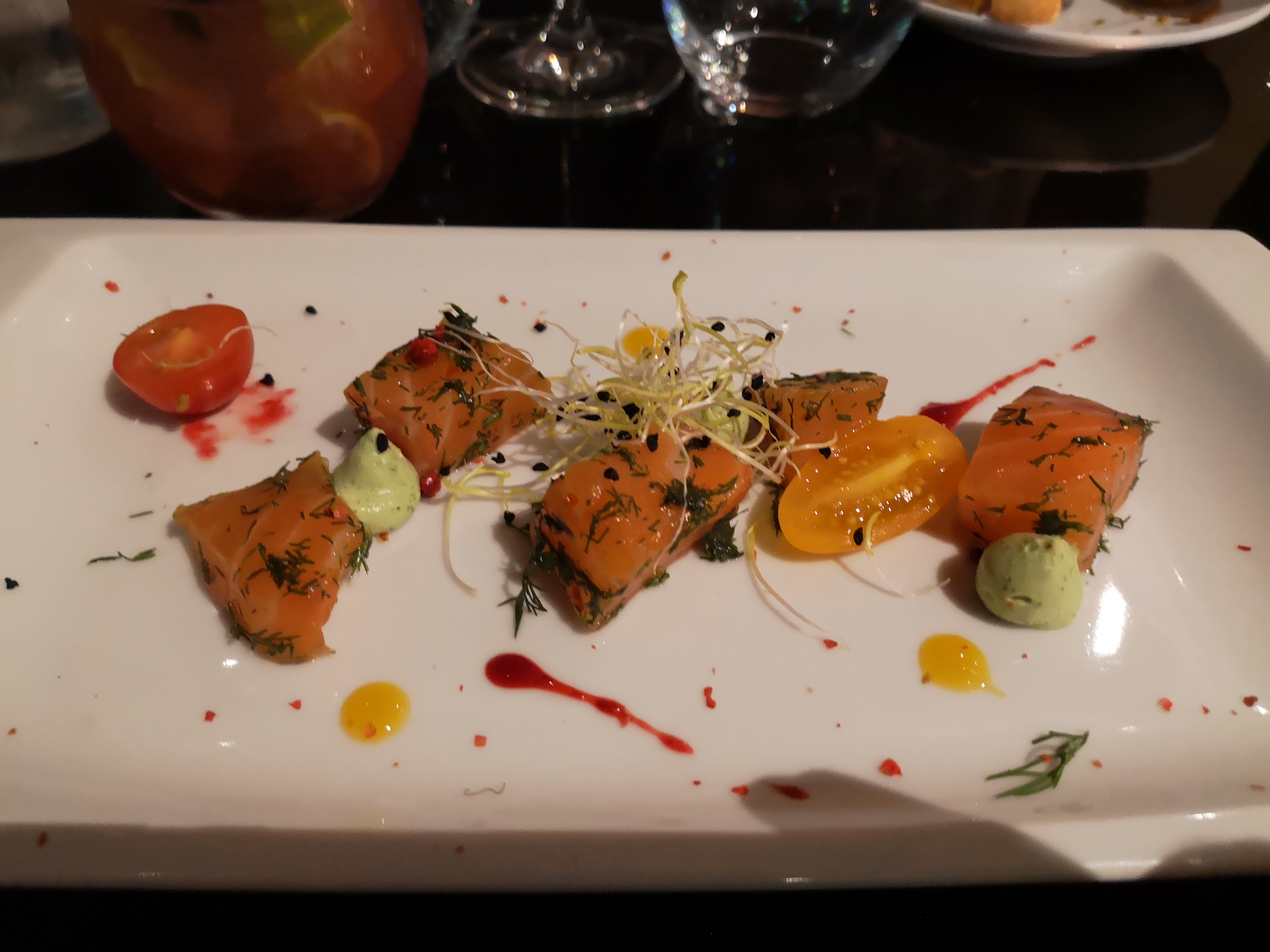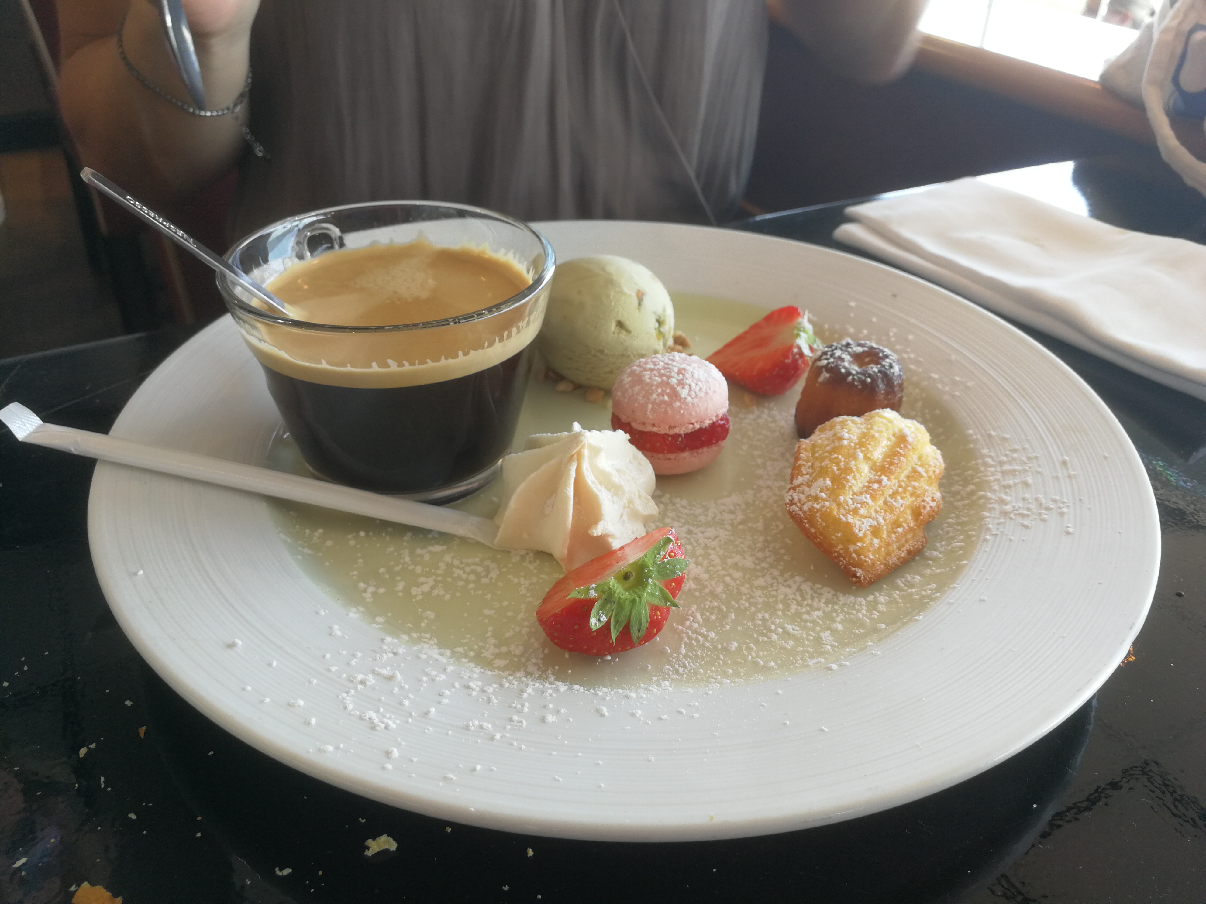 Bon accueil et service agréable.Bons produits,très belles assiettes sauf pour le café gourmand qui mériterait vraiment d être amélioré tant au niveau présentation qu assortiment.Un bémol cependant concernant la ''propreté'' du seau à champagne et de la verrine dans laquelle la tapenade nous fût servie.Un bon coup de chiffon aurait certainement suffit à enlever toutes ces auréoles et ces tâches sèches d eau On ne s attend pas à de telles erreurs dans ce genre de restaurant.Quant aux tarifs ce n est pas à la portée de tout le monde mais grâce à la réduction obtenue sur le site de '' La fourchette '' c est correct.