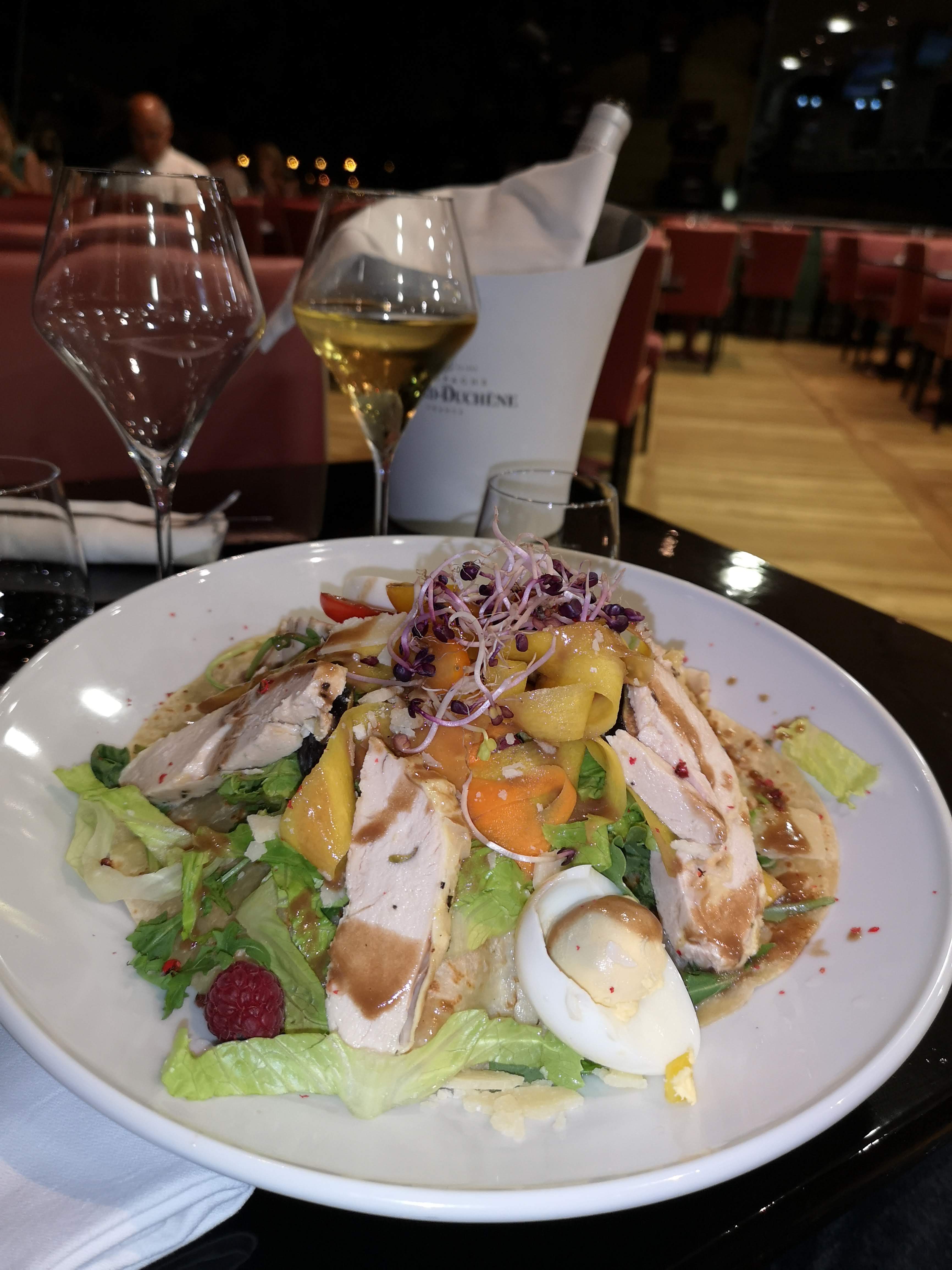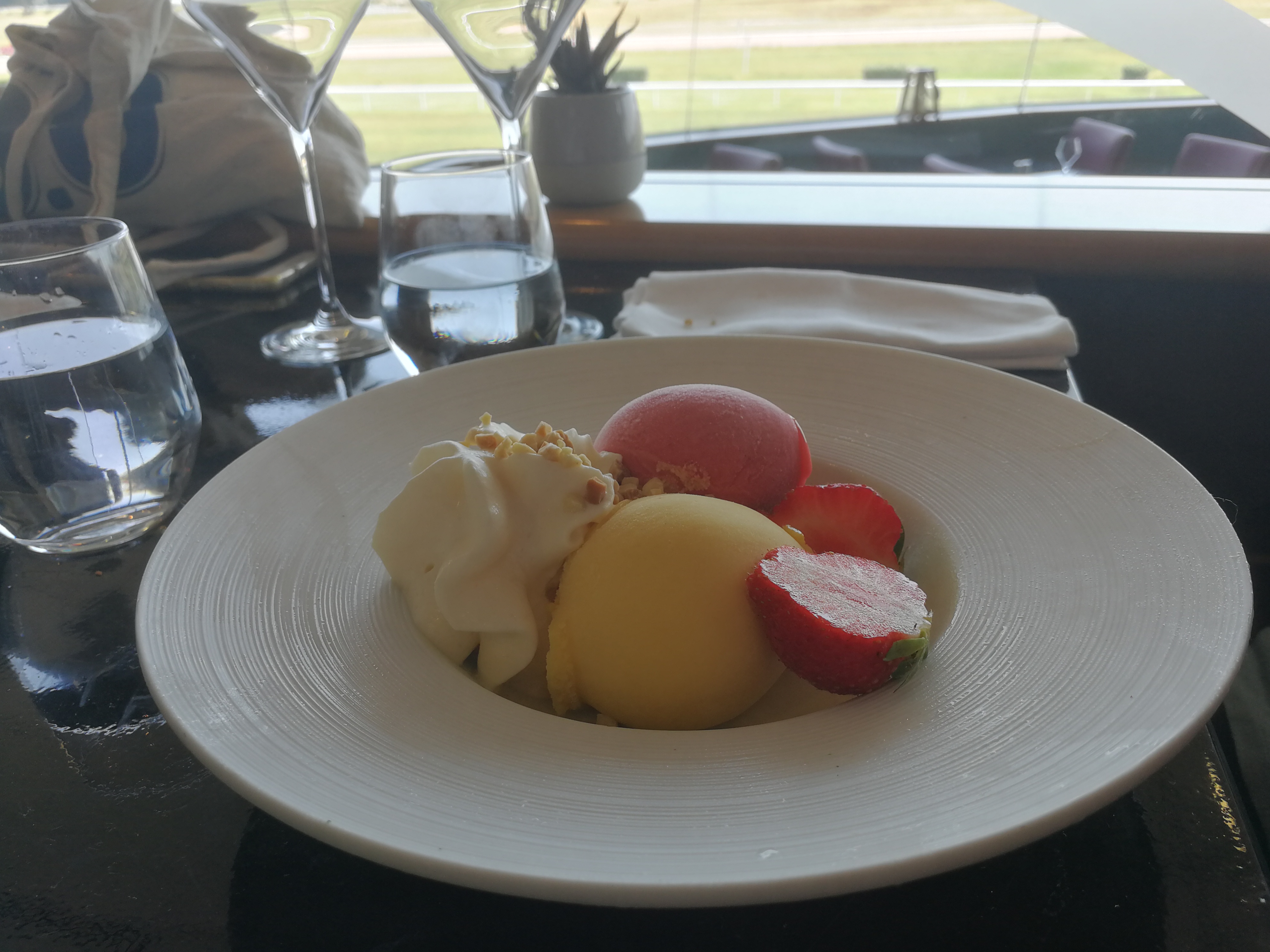 Bof bof...le pain est sec, les gambas sont pâteuses...la bonne note revient au dessert relativement bon notamment la soupe de fraises. Le personnel est très sympa et efficace. La vue est belle sur l'hippodrome. C'est un restaurant potable mais le prix ne correspond pas à la qualité de ce qu'on sert.