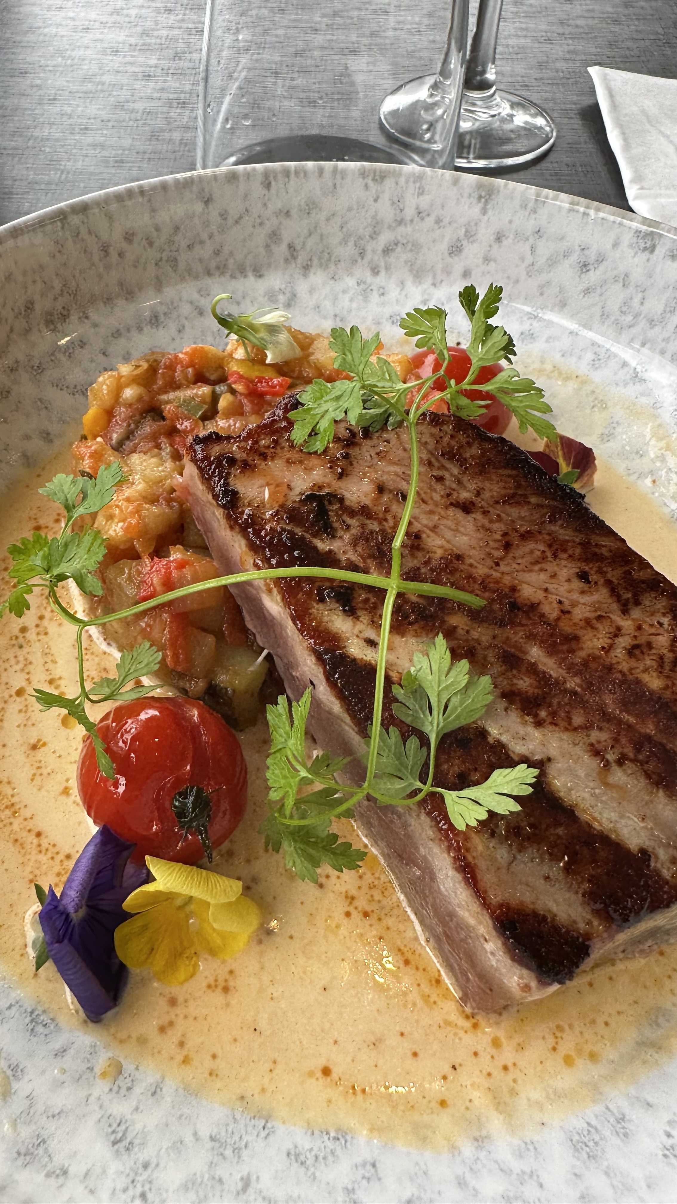 Super cadre, le thon était excellent, la sphère en chocolat un bonheur pour les amoureux du chocolat, le sourire toujours présent, je prends toujours un réel plaisir à venir déjeuner, merci.