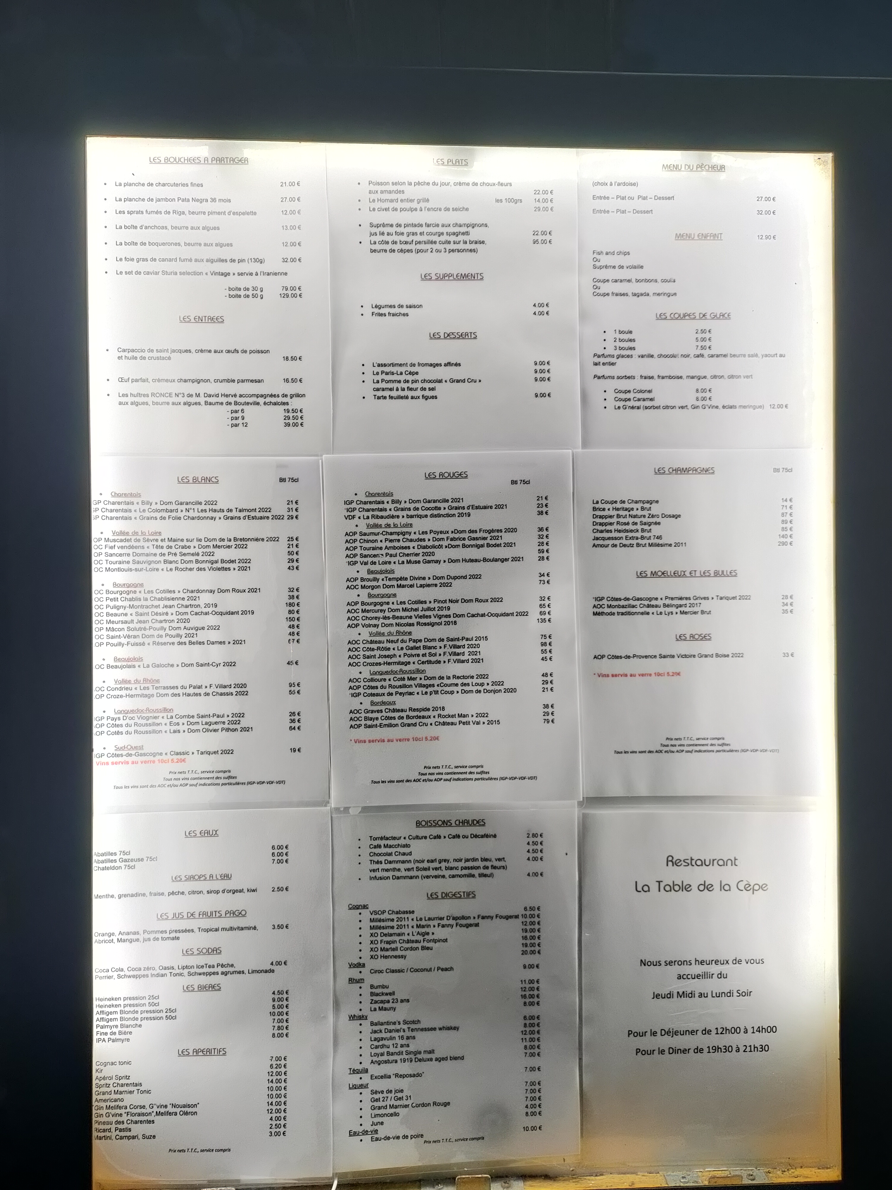 Resto que nous adorons petit menu à 24,90€ entrée plat dessert leur vin rouge MLaribaudière un Merlot est excellent un peu trop cher 40€ mais à découvrir car c'est un vin des Charentes. Allez y absolument...
