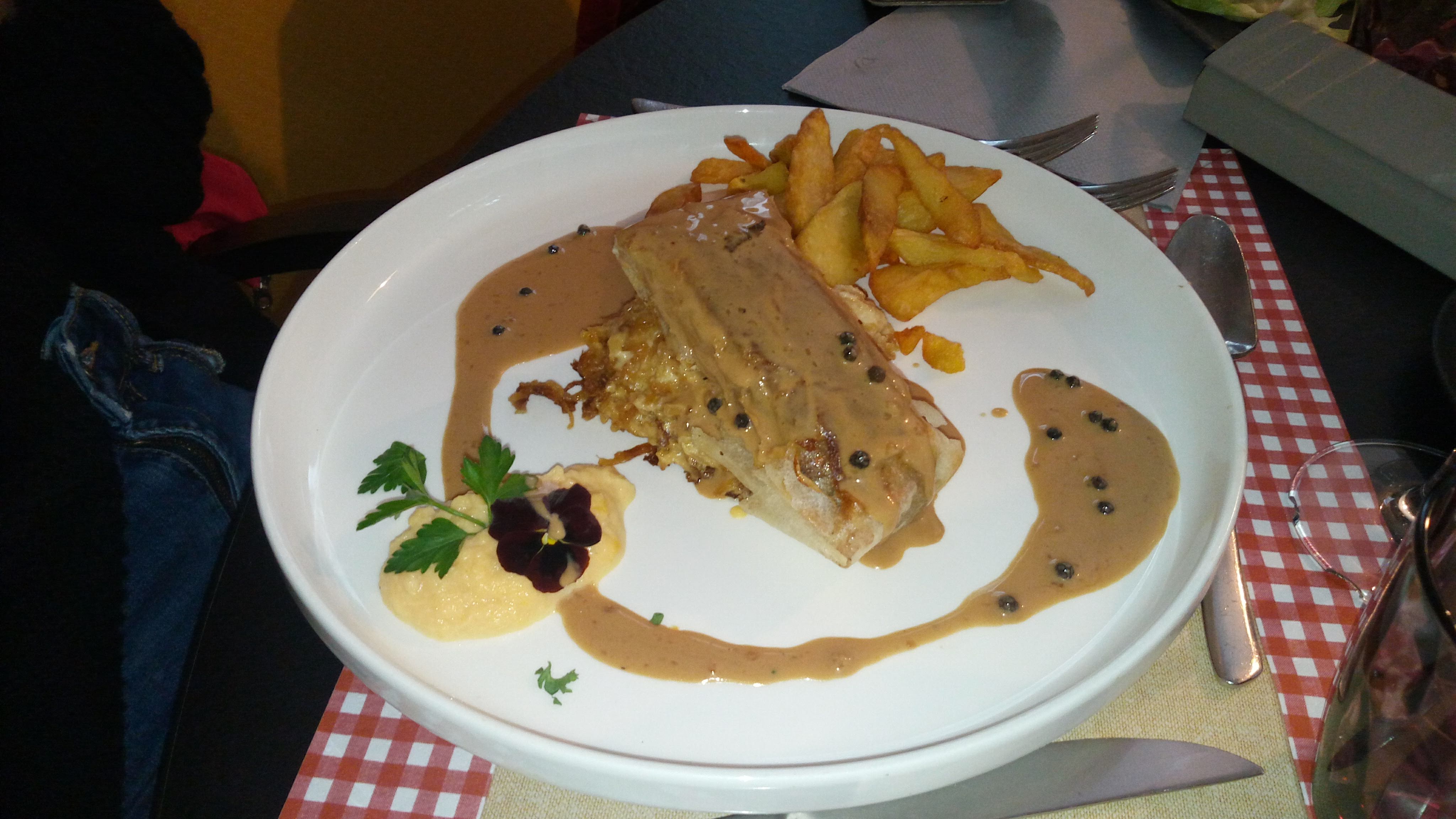Je ne met que 4 étoiles ce qui est tout de même très bien, parce que j’ai mangé deux soirs dans ce restaurant et la deuxième fois j’ai eu une mauvaise expérience, certainement due au manque d’expérience (pardon pour la répétition) du jeune serveur.... je ne développerai pas plus ce n’est pas nécessaire. Sortit de cela, c’est un très bon restaurant, menus originaux et très bon rapport qualité prix, patron et serveuse très sympa. Sur les photos vous pouvez voir, entrée saumon et gratin au chèvre, et en plat, pavé de bœuf en fines tranches et filet de kangourou