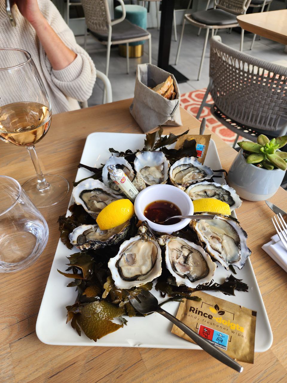 Nous voulions déjeuner près du marché, mais il n'y avait pas de place. Et cet endroit était à proximité. Nous sommes très heureux de nous y être lancés. S'asseoir sur la terrasse est très confortable. Le menu est super ! Nous avons pris du risotto au homard 5 points, des huîtres, du cabillaud était très bon. Bon service. je recommande