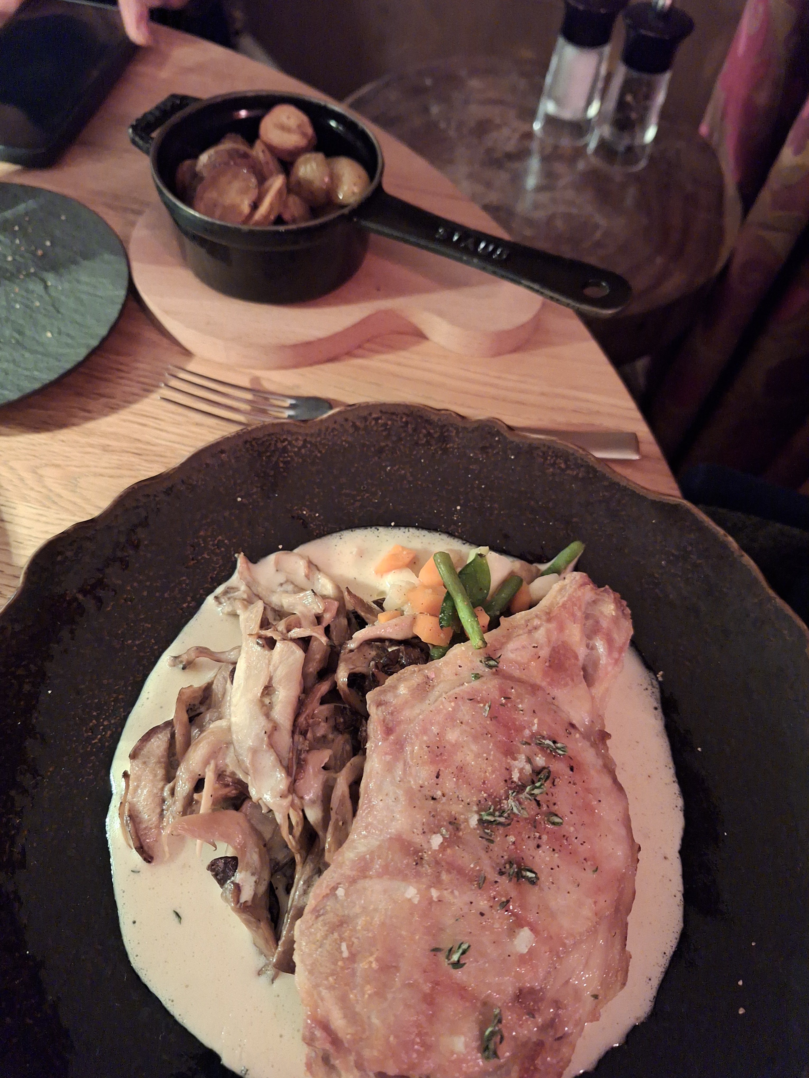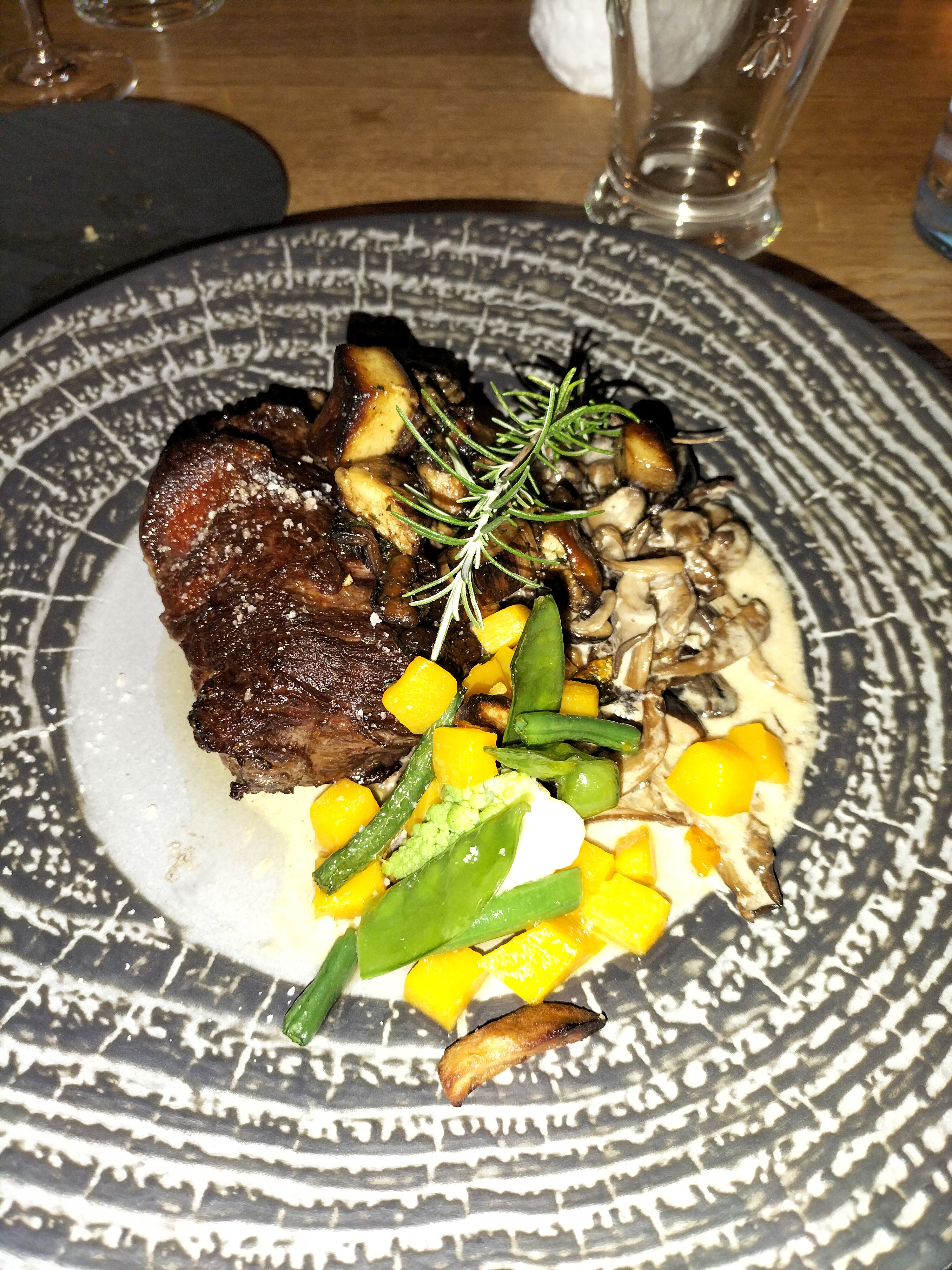 Portions généreuses, personnel sympa, cadre romantique, cuisson non conforme à ma demande et viande sèche (plat sans sauce), et très peu de légumes. Idem pour le plat végétarien. Globalement trop cher pour le service.