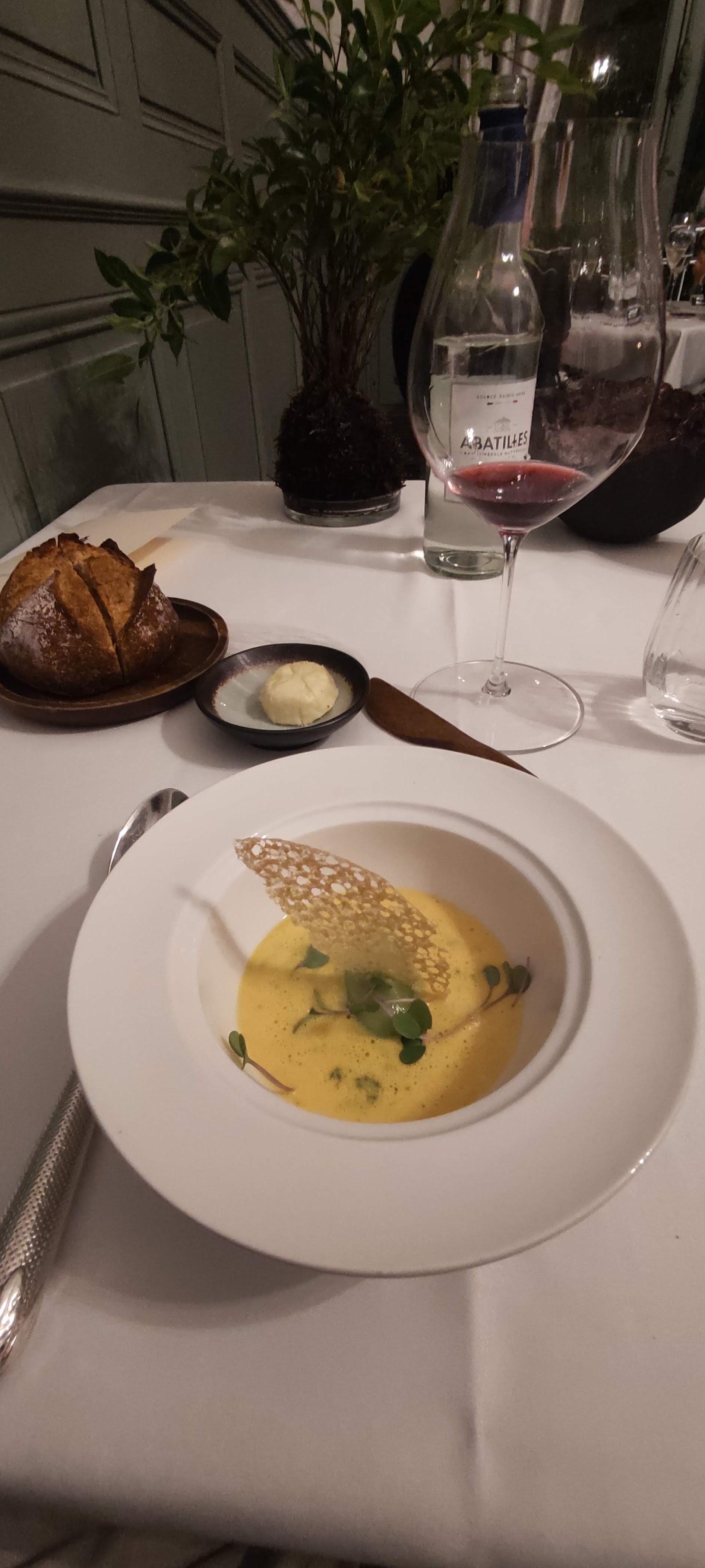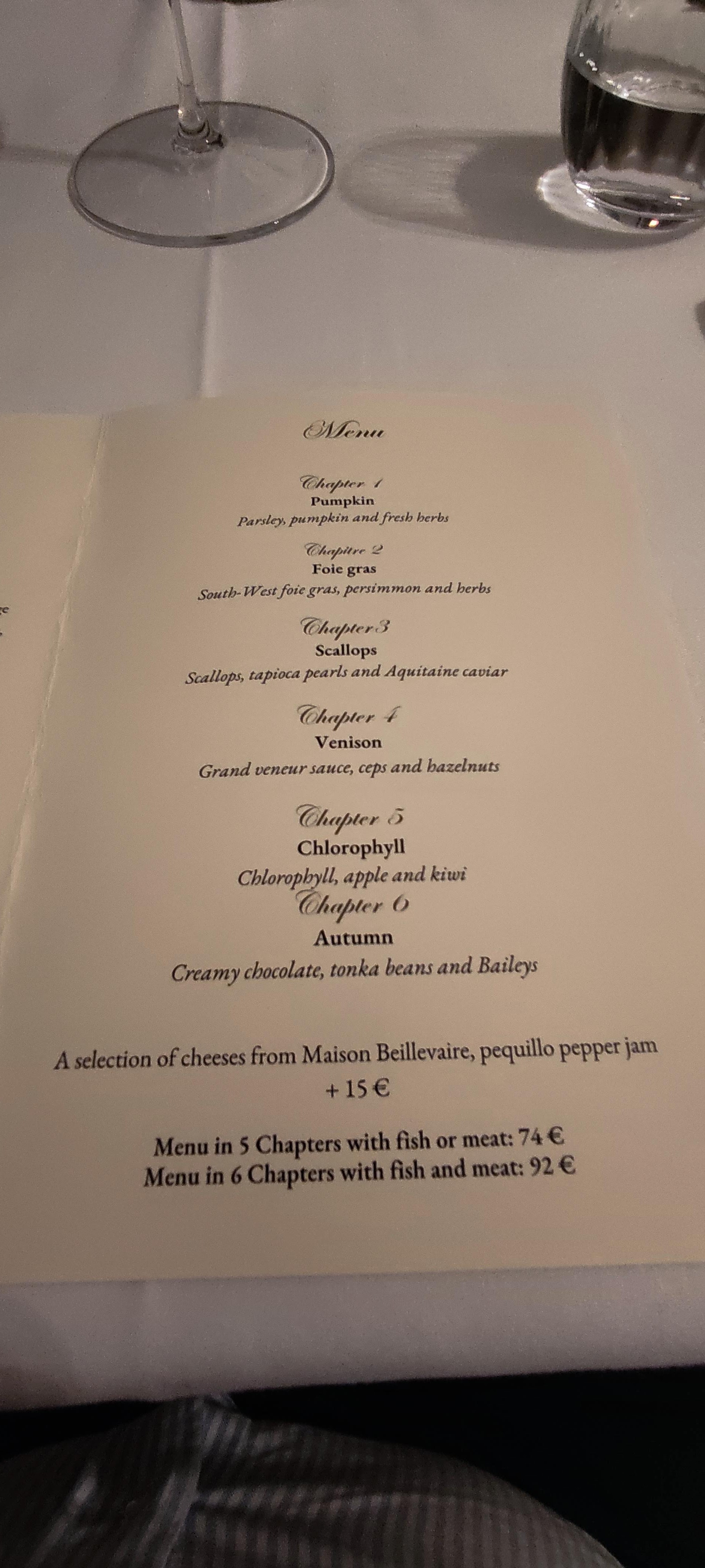 Un dîner hors du temps. Dans une ambiance intimiste, discrète mais chaleureuse. Vous êtes sûr de passer un agréables moments que ce soit grâce à un service des plus impeccable, à des attentions de la part du personnels de salles, ou bien de part la cuisine qui sera ravir et surprendre vos papilles. Un excellent travail du chef et de la cuisine pour ce dîner en 5 services. Un sans fautes.