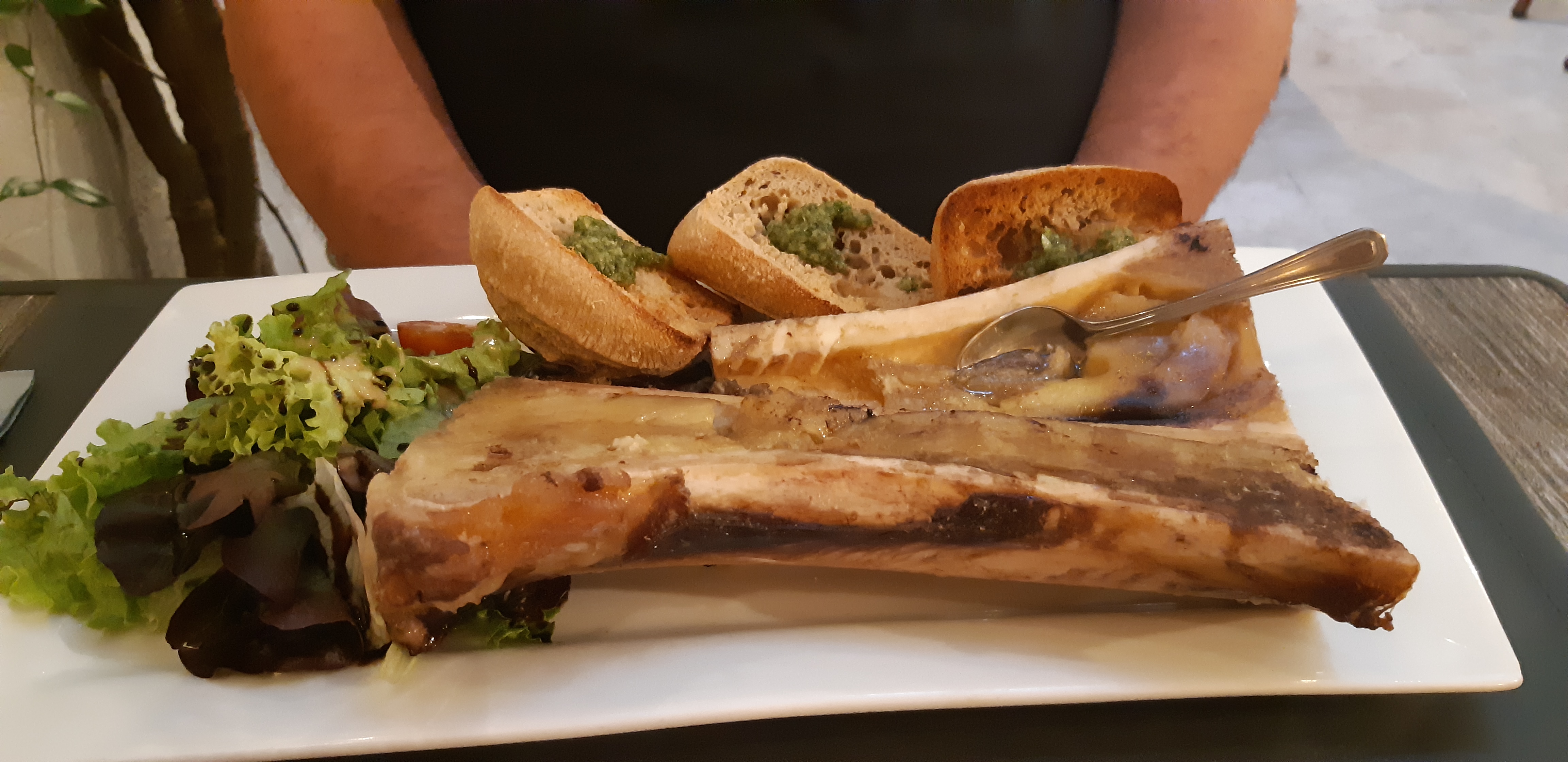 Un vrai régal ! Entrecôte et os à moelle au feu de bois un délice , cadre magnifique dans le patio