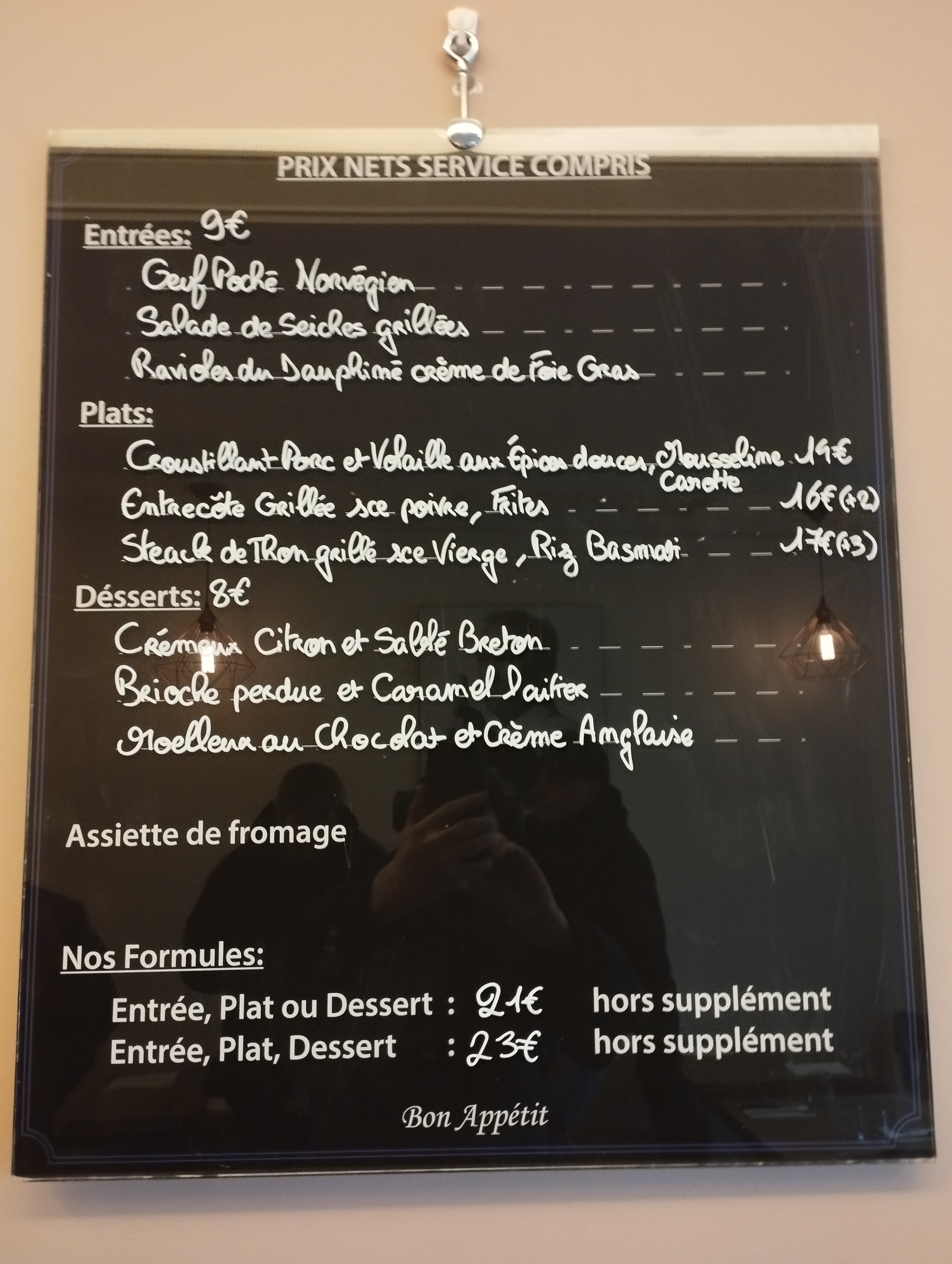 Cuisine Française simple mais de qualité. Entrée, plat, dessert à l'ardoise pour 25 euros environ sans boissons. J'y retournerai et je recommande. Par contre attention c'est petit, donc mieux vaut réserver.