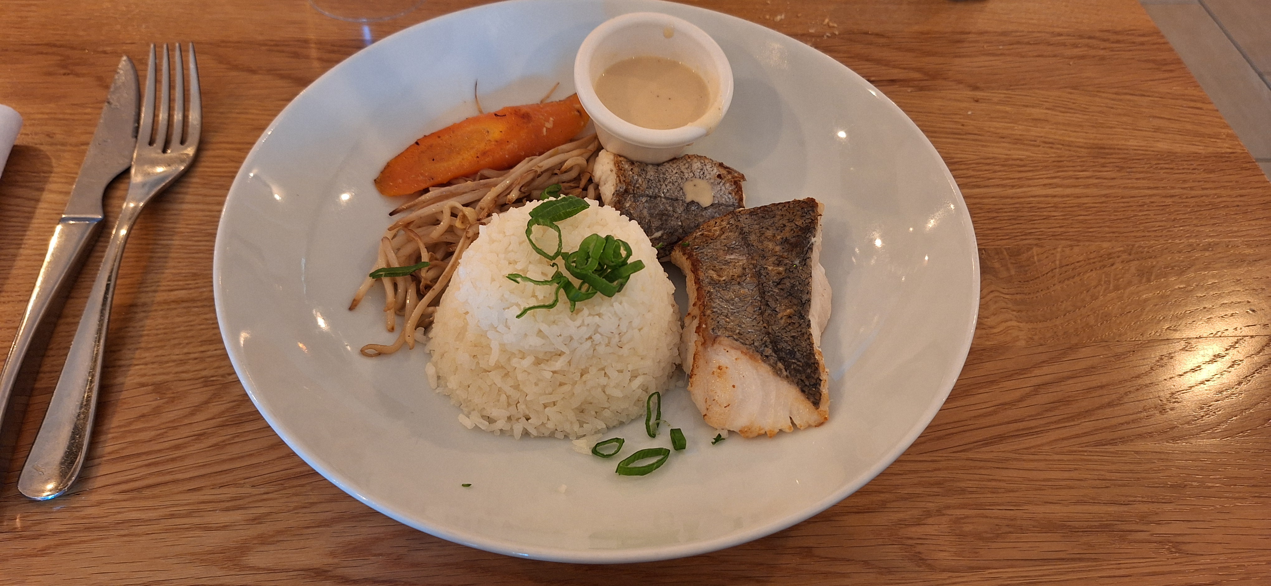 Nous sommes arrivés ici après une longue journée. C'était très calme, mais après une agréable conversation, il est devenu clair que ce restaurant attire de nombreux clients, surtout à l'heure du déjeuner. Le saumon aux légumes était parfait et le risotto aux coquilles Saint-Jacques était juste et très savoureux. Ne vous laissez pas rebuter par le voisinage des autres restaurants et du centre commercial. Le service est bon et c'était délicieux.